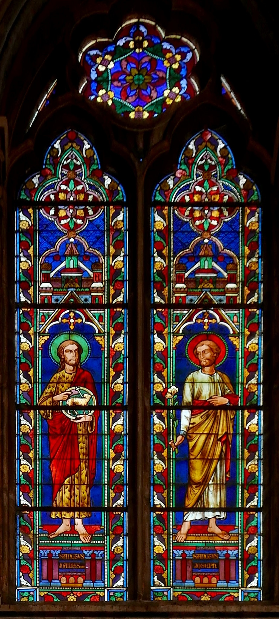 Masswerkfenster mit zwei in Nonnenköpfen endenden Lanzetten; darüber Sechspass als Couronnement. Das Obergadenfenster zeigt einen Vorläufer sowie den Vater von Jesus Christus auf blauem Grund: Johannes den Täufer mit einer Darstellung des Siegeslammes in der linken Lanzette; Joseph mit einer Lilie in der rechten Lanzette. Die Figuren stehen auf einem architektonischen Sockel mit jeweiligem Namenszug und sind von schmalen Säulen flankiert, über denen sich Baldachine im Stil der Gotik und je ein Vierpass erheben. Die Lanzetten haben farbige ornamentale Rahmen. Im Couronnement konzentrisch angeordnete Blüten- und Blattornamente; zudem mehrere Masswerkspickel mit farbigen Füllungen.