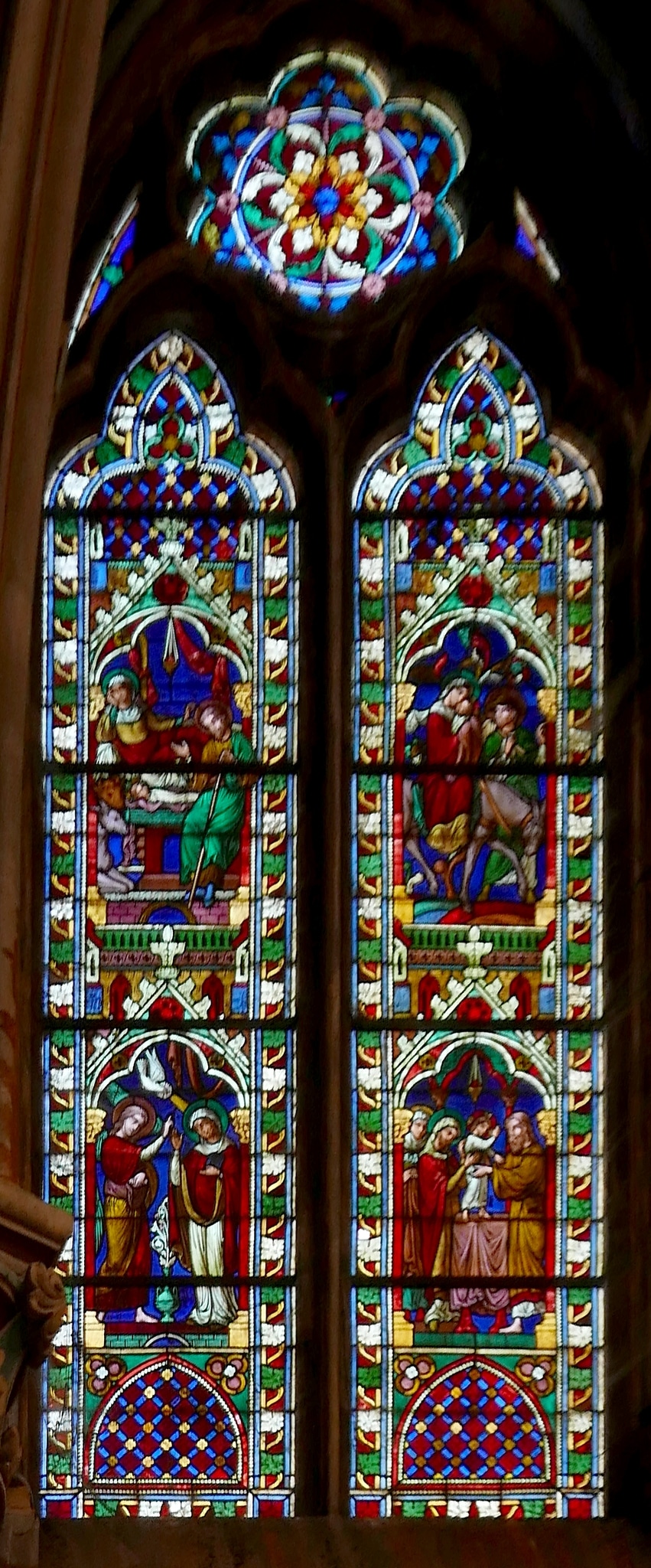 Masswerkfenster mit zwei in Nonnenköpfen endenden Lanzetten; darüber Sechspass als Couronnement. Beide Lanzetten enthalten über einem architektonischen Sockel zwei Bildszenen auf blauem Grund, die von krabbenbesetzten Baldachinen im Stil der Gotik überfasst und von unten nach oben und von links nach rechts gelesen werden. Links unten ist die Verkündigung gezeigt (Lk 1, 26–38): Der Engel Gabriel steht mit erhobener Hand vor Maria, über ihm schwebt der Heilige Geist als Taube, dessen Strahlen sich auf Marias Haupt senken. Links oben ist die Geburt Jesu Christi dargestellt (Lk 2, 7): Maria und das Kind sind neben den sitzenden Joseph gebettet, links erscheinen Esel und Ochse. Die Bildszene unten links zeigt die Präsentation im Tempel (Lk 2, 25–35): Maria reicht Simeon am Altar das Jesuskind, hinter ihr steht vermutlich die Prophetin Hanna. Oben rechts ist die Flucht nach Ägypten (Mt 2, 13–14) zu sehen: Joseph führt den Esel, auf dem Maria mit dem Kind sitzt.