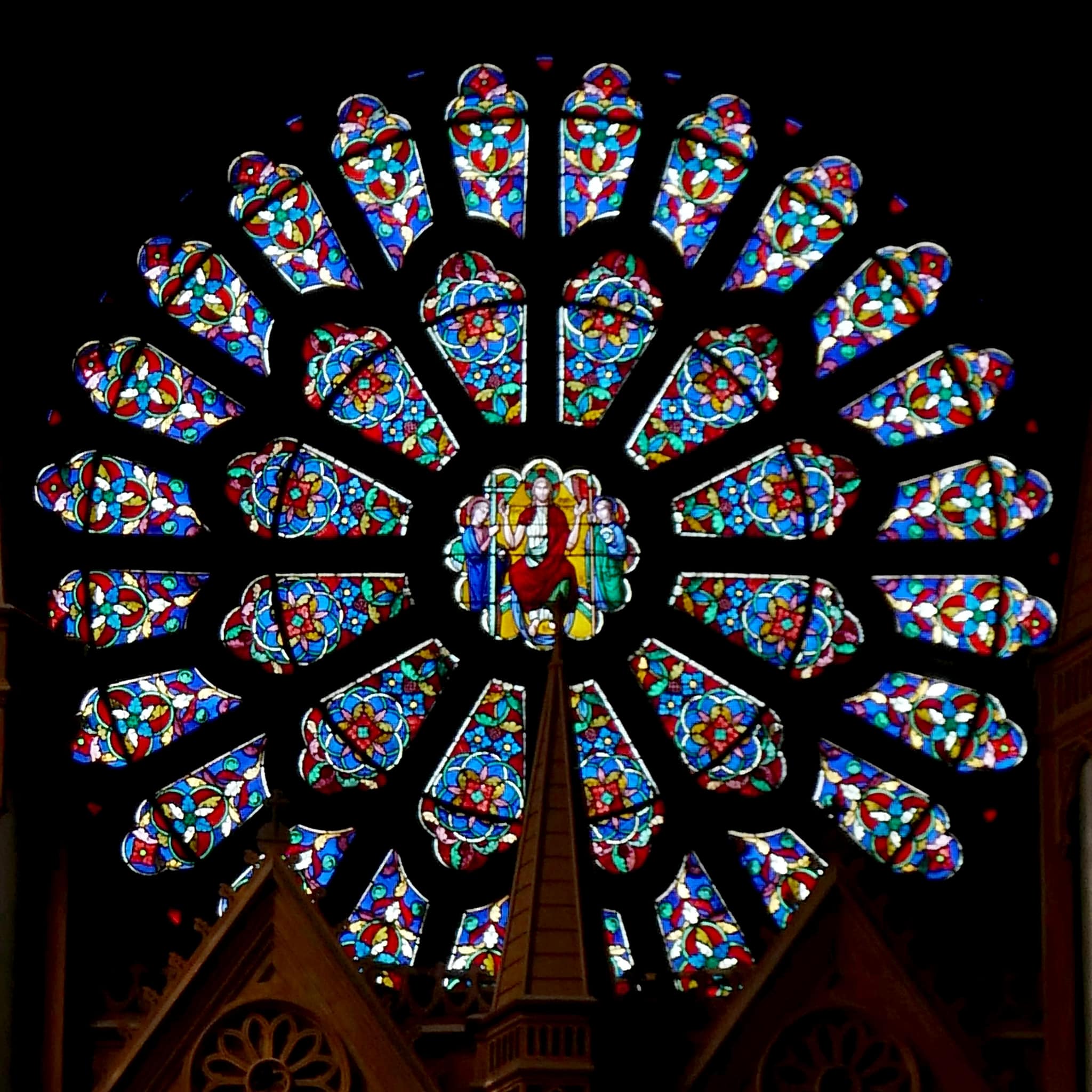 Rosenfenster mit drei kreisförmig angeordneten Registern. Das Zentrum bildet ein Zwölfpass mit dem triumphierenden Jesus Christus, der mit zum Segen erhobenen Händen auf einem Regenbogen thront. Begleitet wird er von zwei Engeln mit Kreuz und Lanze. Rundherum sind zwischen den Radspeichen des Fensters zwölf Lanzetten mit Nonnenköpfen angeordnet, die mit Blatt- und Blütenornamenten dekoriert sind. Das äussere Register ist mit 24 Lanzetten mit Blattornamenten und je einem eingeschriebenen Dreipass besetzt.