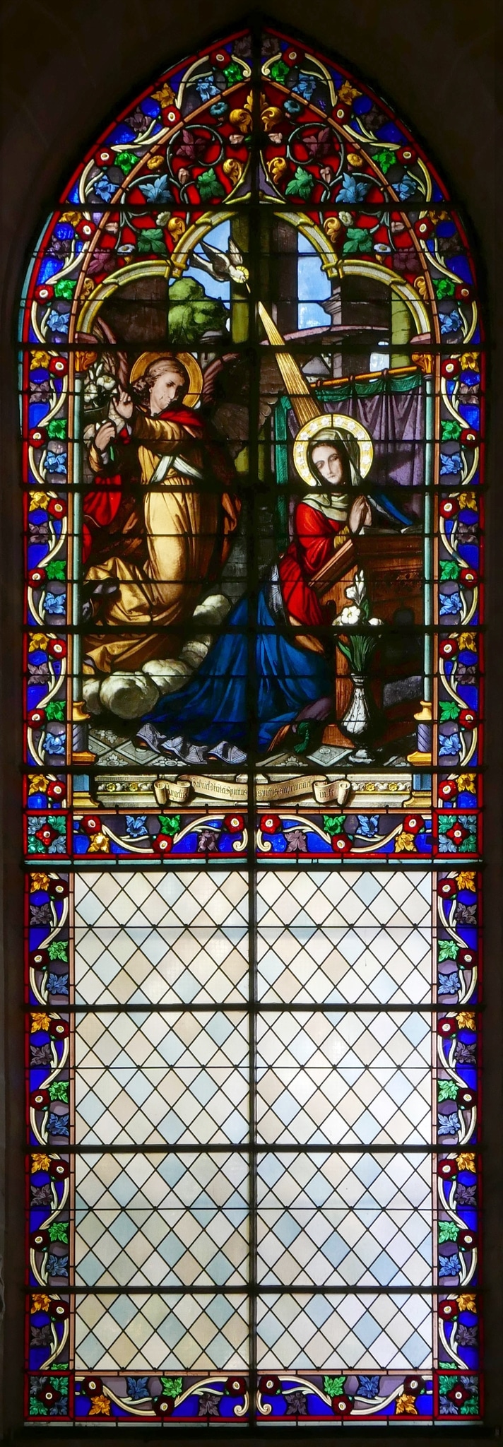 Spitzbogenfenster mit einer Darstellung der Verkündigung an Maria durch den Erzengel Gabriel (Lk 1, 26–38) in der oberen Fensterhälfte. Die Jungfrau Maria kniet betend an einem Pult und wendet sich zum Engel um, der mit einem Lilienstrauss auf einer Wolke erscheint. Darüber schwebt der Heilige Geist als Taube; seine Strahlen erreichen das Haupt Marias. Die Bildszene ist von einer Bogenarchitektur im Stil der Gotik eingefasst: über einem Sockel mit Schriftband erheben sich zwei schmale Säulen, die einen Baldachin mit Blattranken tragen. Ein farbiger Rahmen mit Blatt- und Blütenmuster umfasst sowohl die Bildszene wie auch die übrige, mit Rauten verglaste Fensterfläche.
