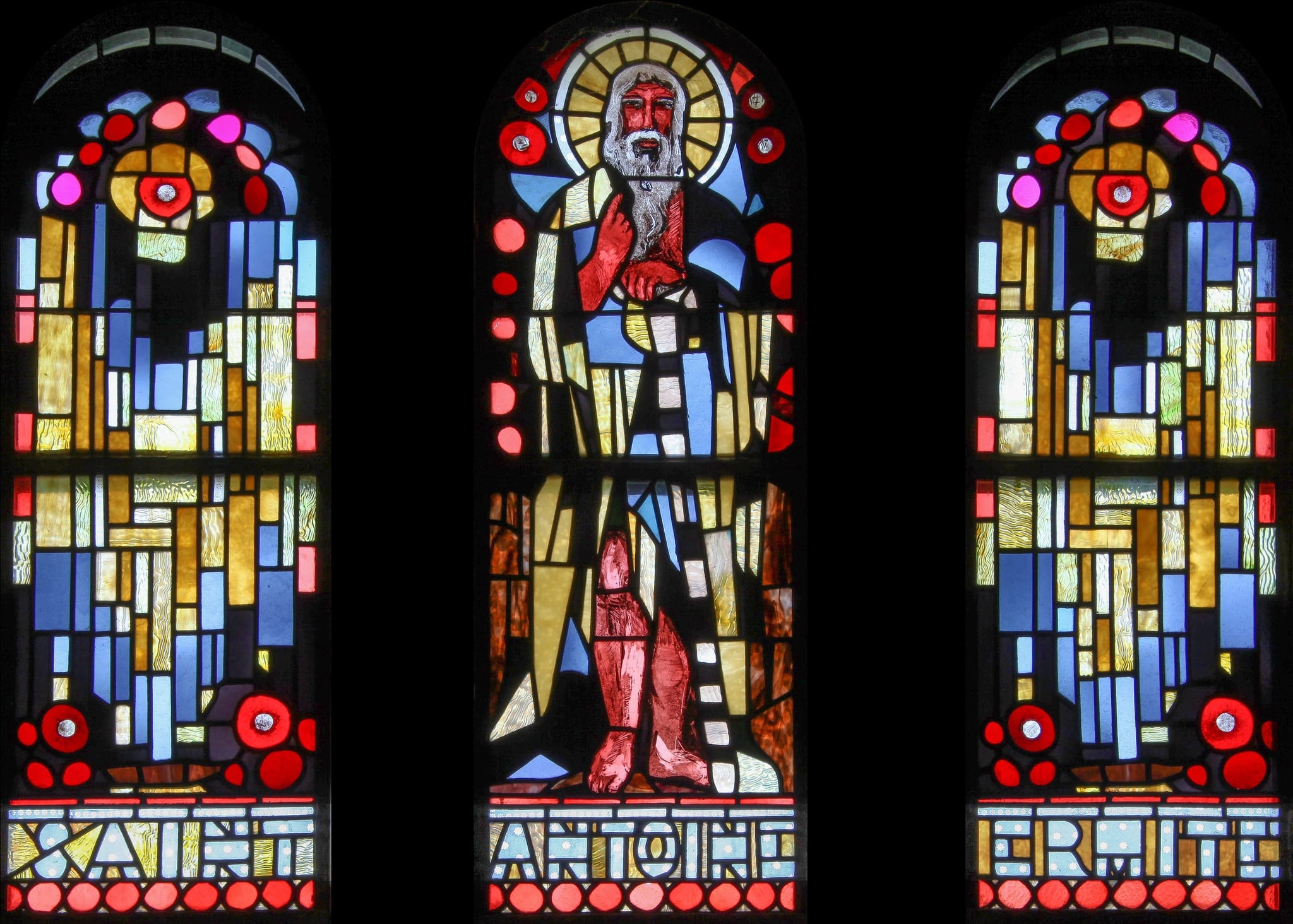Vitrail composé de trois baies avec saint Antoine au centre. Il est figuré debout, de face, auréolé et portant une grande barbe blanche. Il s’appuie de sa main gauche sur un bâton se terminant en T en son sommet et montre le ciel de son index droit. Il est vêtu d’une longue tunique qui dévoile le bas de ses jambes nues.