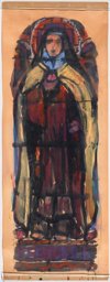 La mise en perspective de la maquette (VMR_1226a) avec les cartons (KF_1303 et KF_1306) et le vitrail dédié à Thérèse de Lisieux nous offre l’opportunité de mieux comprendre la méthode de travail de l’artiste. Cingria fixe rapidement les lignes définitives de sa figure sur la maquette et ne fait que de légers changements sur le carton, comme la position des deux roses aux pieds de la sainte, ainsi que la hauteur de sa main droite. Alors que le dessin de la sainte est très précis sur la maquette, il est beaucoup plus esquissé sur le carton, ce qui est paradoxal, puisque normalement c’est le carton qui sert de base à la création du vitrail. Mais comme Cingria le relate dans ses Souvenirs d’un peintre ambulant, il renonce souvent aux cartons peints, étape qu’il juste “inutile et bête” : “Une petite maquette pour les couleurs, et une mise en place sommairement ébauchée puis épurée par un calque précis me suffisent. De cette façon, j’arrive à plus de justesse dans mes tons, que je ne fausse pas en tâchant de transcrire ceux d’un carton forcément fatigué, puisqu’il est recopié d’une maquette” (Cingria, 1933, p. 119-120). A Orsonnens, il n’a pas abandonné le carton, mais celui-ci lui permet principalement de définir la taille et la forme des pièces de verre et de nuancer quelque peu les coloris, qui sont encore retravaillés sur le vitrail.