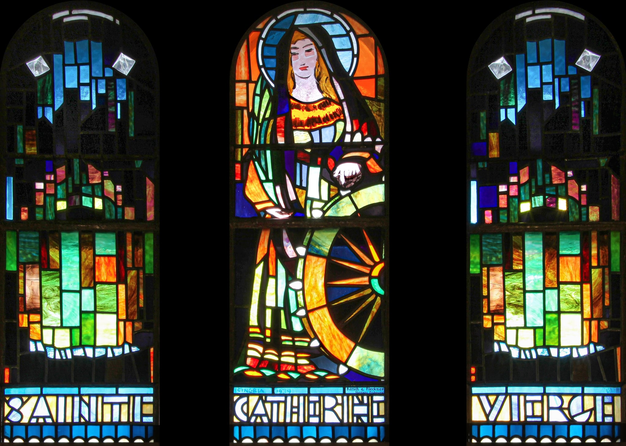 Vitrail composé de trois baies avec sainte Catherine d’Alexandrie au centre. Elle est figurée debout, de face et auréolée. Portant un voile sur de longs cheveux roux, elle tient la palme de son martyre dans son bras droit et a sa main gauche posée sur une grande roue dentelée, posée à ses pieds.