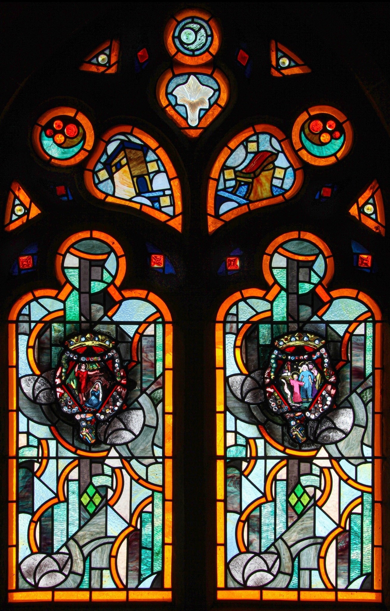 Vitrail à deux lancettes avec au centre de chacune d’elle une scène de la vie de la Vierge inscrite dans un losange : à gauche, l’Assomption et, à droite, la Visitation.
