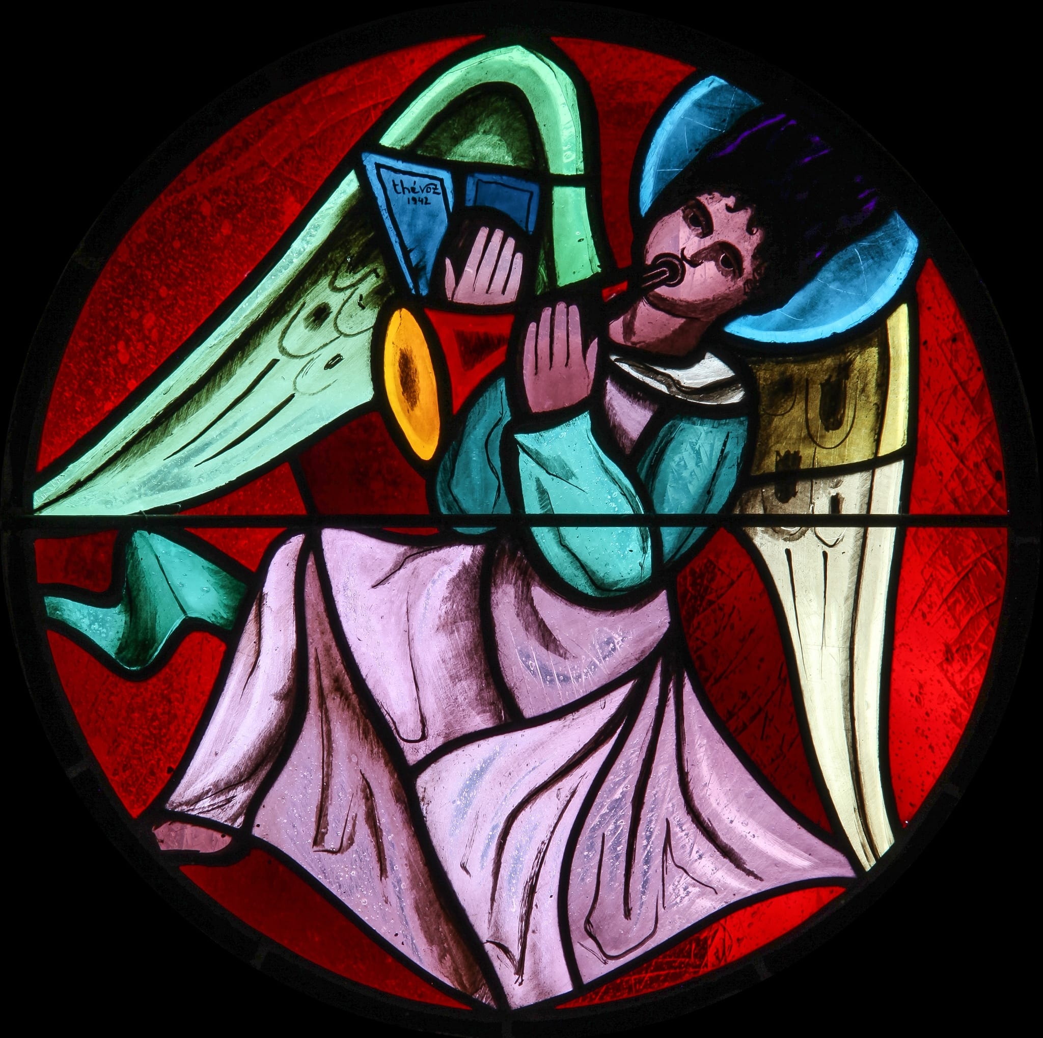 Il semble que ces deux petites verrières n’étaient pas prévues à l’origine du projet (Monnard, 1942) et que Thévoz les ait ajoutées ultérieurement à son programme. Comme au sommet de chacun des vitraux de la nef, il y présente un ange. Chacun joue d’un instrument et fait écho aux orgues qui se trouvent au centre de la tribune. Sur cette verrière, Thévoz a intégré sa signature au verso de la partition que tient l’ange. Stylistiquement, le dessin est de la même veine que l’ensemble des vitraux de la nef : simple, clair et parfaitement lisible.