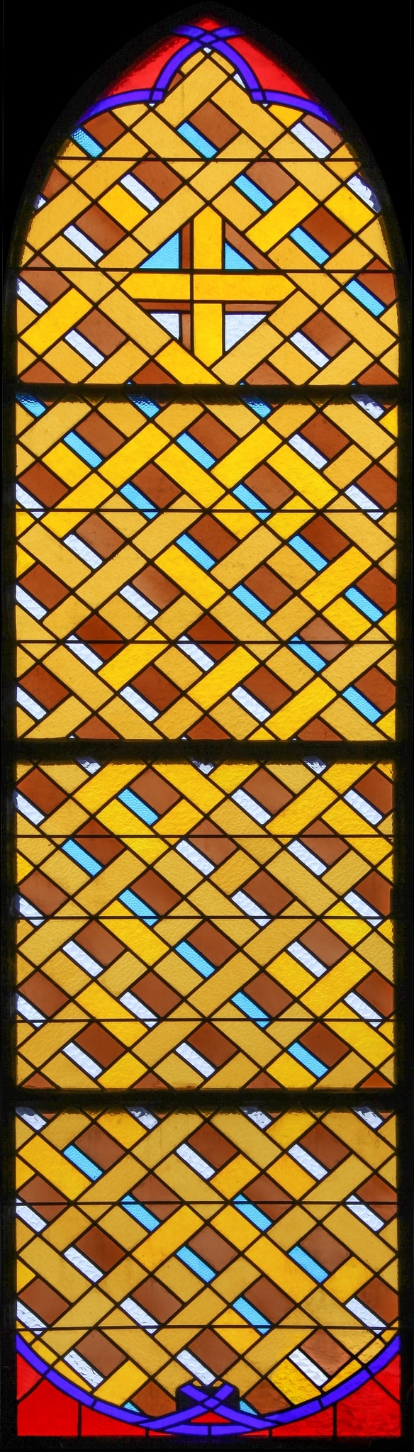 Ce vitrail géométrique est composé d’un quadrillage losangé sur toute la hauteur dans des teintes de jaune moutarde, de brun et de bleu, avec une croix s’érigeant au sommet au centre. En bas et en haut, un filet bleu sur un fond rouge vient délimiter l’ornementation de la verrière.