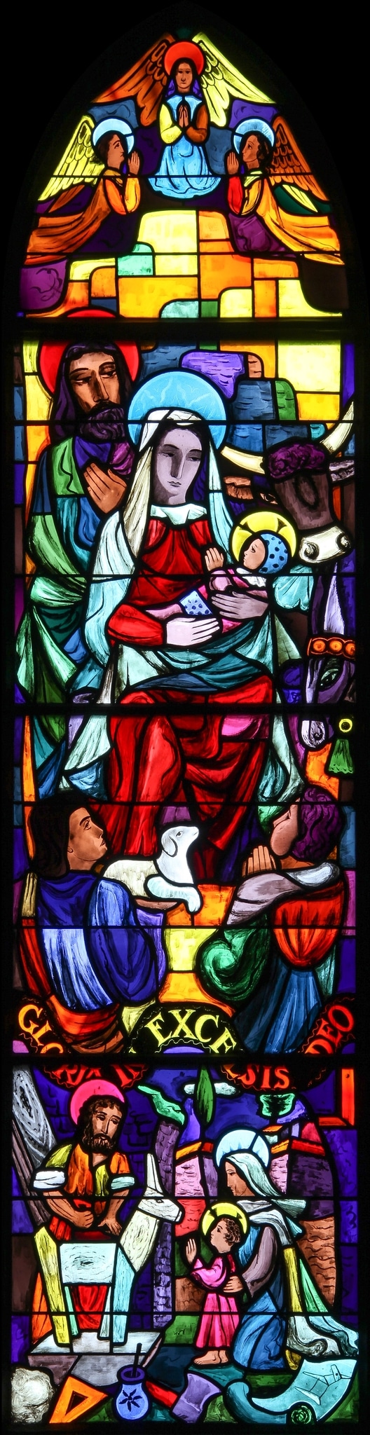 Ce vitrail consacré à la Nativité et à la Sainte Famille se situe dans la quatrième fenêtre de la nef à gauche depuis le choeur de l’église Notre-Dame de l’Assomption d’Attalens. Il est l’oeuvre, comme l’ensemble des verrières de la nef, de l’artiste fribourgeois Gaston Thévoz et de l’atelier A. Kirsch & Co et date de 1942.