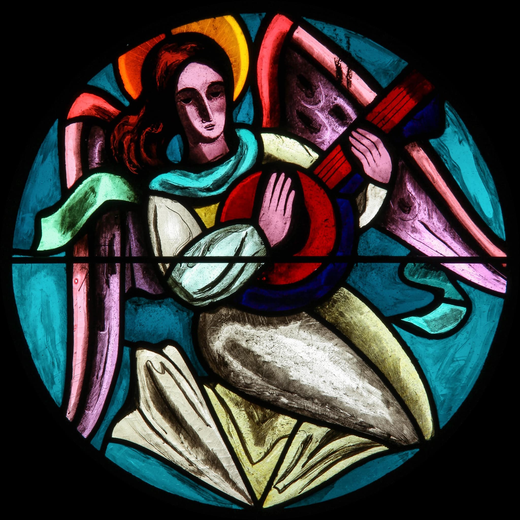 Sur un fond bleu, un ange nimbé agenouillé, les ailes ouvertes et portant une longue tunique blanche, joue du luth.