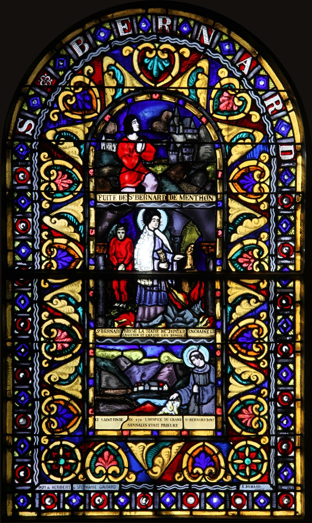 Cette verrière est composée de trois scènes superposées relatant différents épisodes de la vie de saint Bernard de Menthon, encadrées d’une très large bordure à motifs végétaux et géométriques.