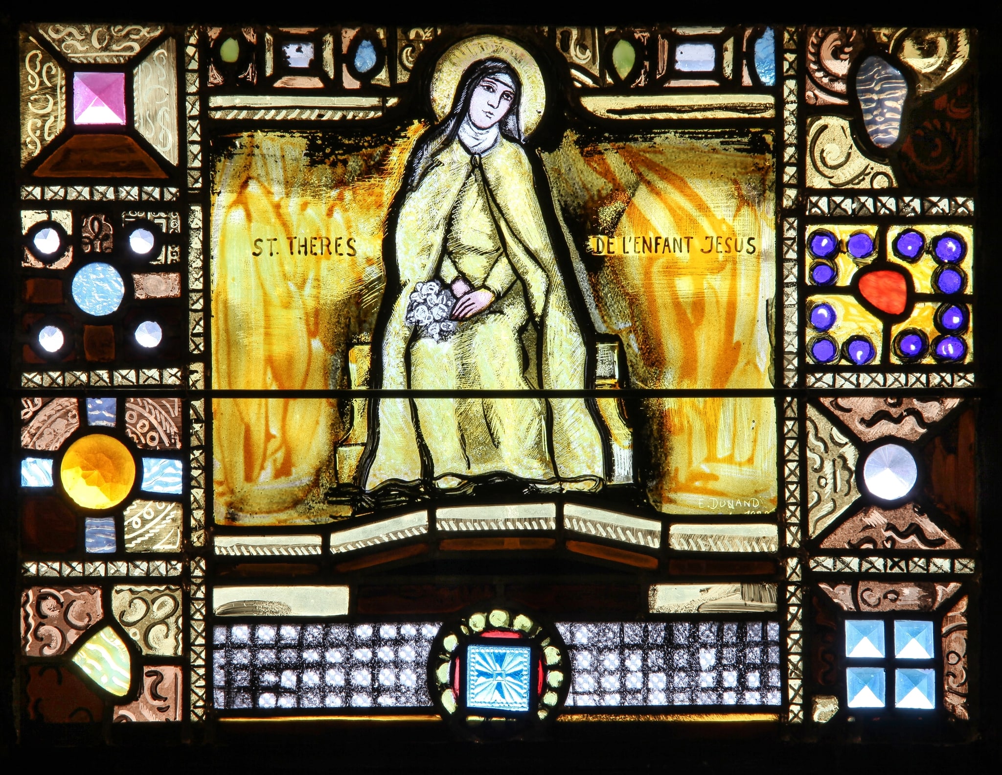 Au centre du vitrail, Thérèse de Lisieux (Thérèse de l’Enfant Jésus), nimbée et couverte du voile carmélite, est assise de face et tient un bouquet de roses blanches posé sur ses genoux. Elle est vêtue de jaune doré avec quelques touches orangées, et se détache sur un fond dans les mêmes teintes.