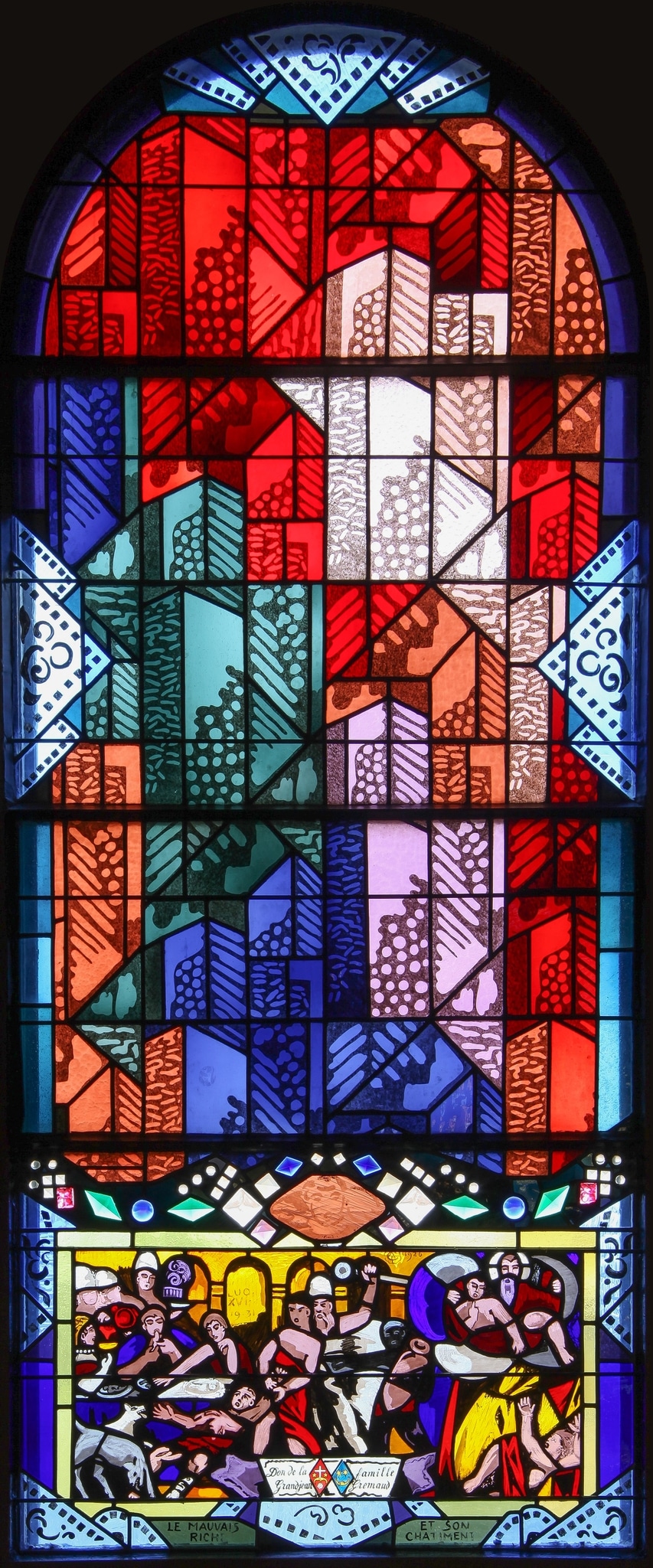 Une guirlande multicolore de cabochons et verres structurés sépare les deux secteurs, avec au centre une tête d’ange ailé inscrite dans un losange.