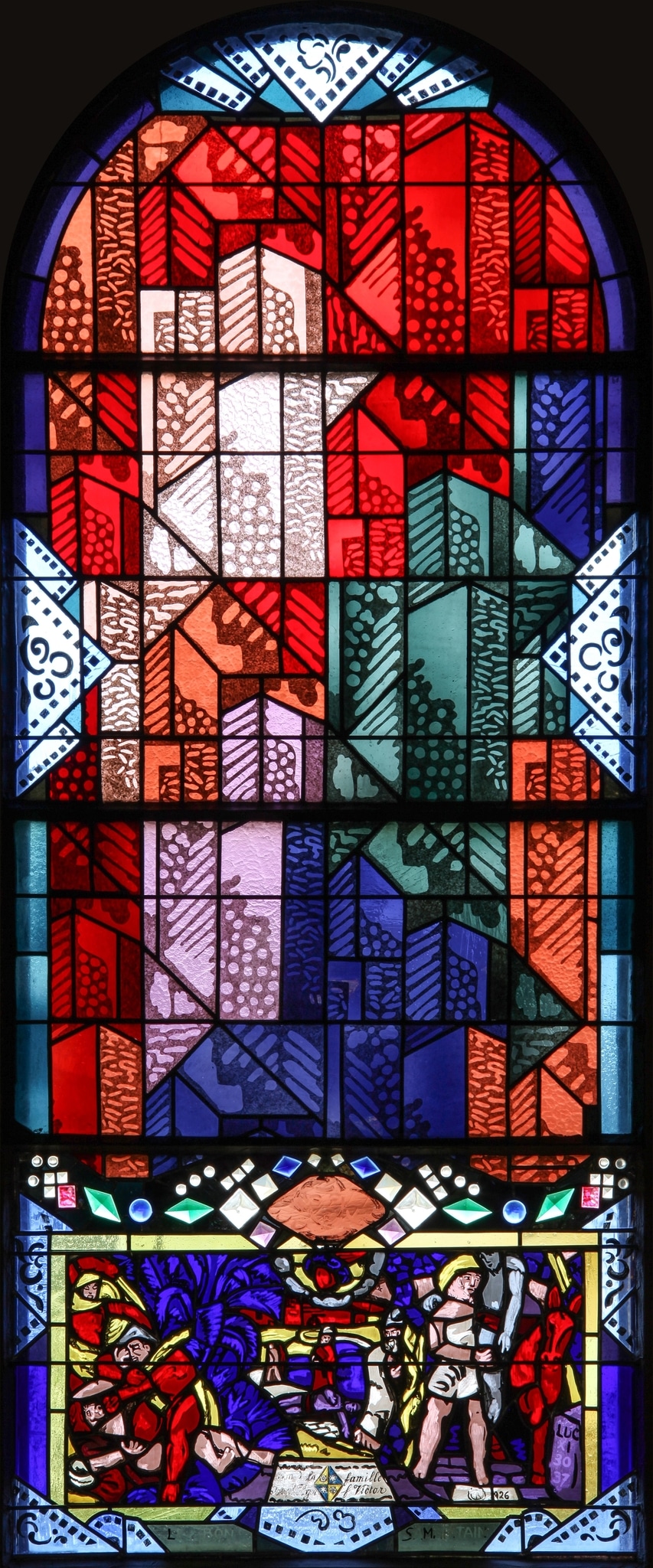 Ce vitrail a été réalisé en 1926 par Alexandre Cingria pour la nef de l’église Notre-Dame-de-l’Assomption d’Echarlens.