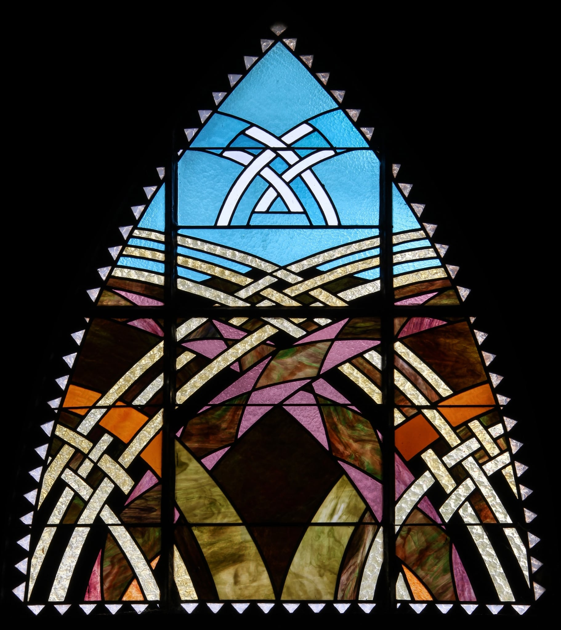 Ce vitrail est composé, dans sa partie inférieure, de plusieurs lignes courbes parallèles partant des bords extérieurs de la fenêtre pour se croiser au centre et former un arc brisé, alors que d’autres lignes courbes plus courtes partent du centre vers les côtés extérieurs de la verrière. Ces lignes sont de largeur et de couleur différentes et composées de verres variés (verres américains et verres de différentes textures). Sur la partie supérieure du vitrail, ce motif d’arc brisé se répète de manière simplifiée au centre sur un fond bleu.