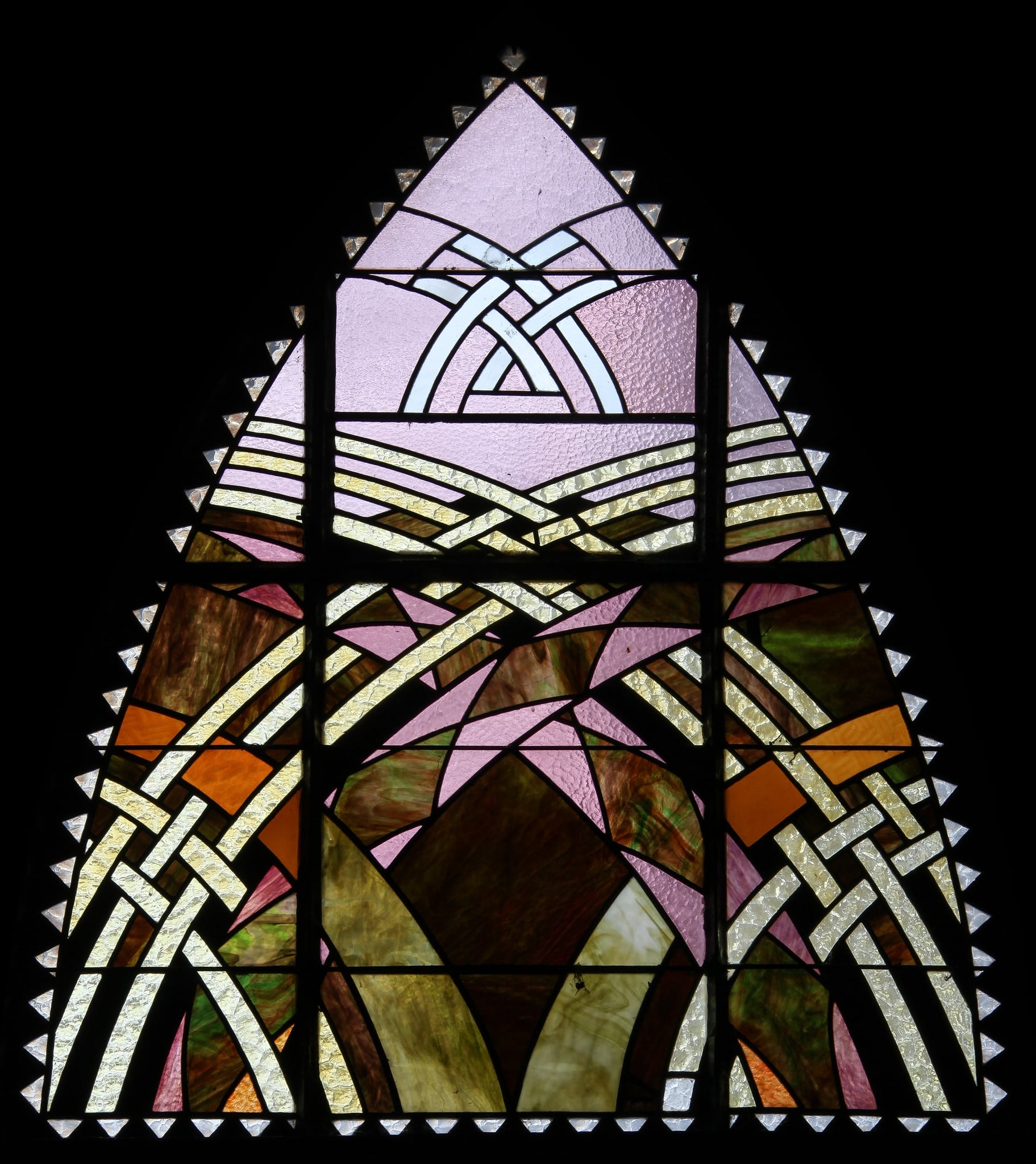 Ce vitrail est composé, dans sa partie inférieure, de plusieurs lignes courbes parallèles partant des bords extérieurs de la fenêtre pour se croiser au centre et former un arc brisé, alors que d’autres lignes courbes plus courtes partent du centre vers les côtés extérieurs de la verrière. Ces lignes sont de largeur et de couleur différentes et composées de verres variés (verres américains et verres de différentes textures). Sur la partie supérieure du vitrail, ce motif d’arc brisé se répète de manière simplifiée au centre sur un fond rose.