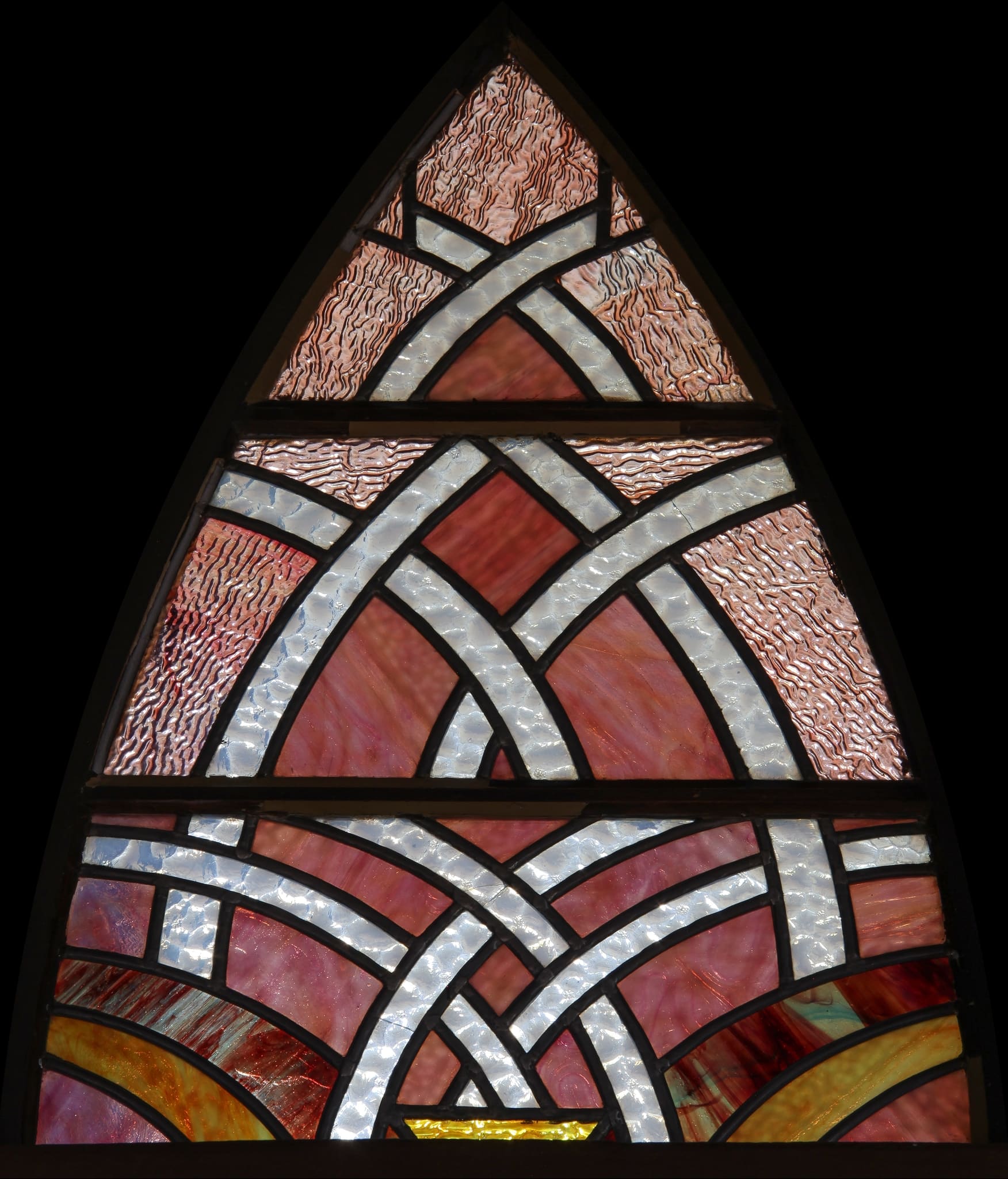 Cette petite fenêtre se compose de plusieurs lignes courbes blanches disposées les unes au-dessus des autres sur un fond rose et partant soit des bords du vitrail, soit du centre.