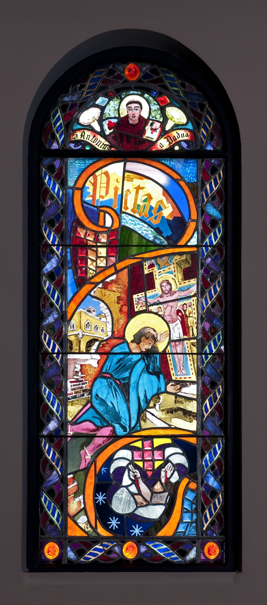 En haut, dans un médaillon, saint Antoine de Padoue, vêtu de la bure, tient un livre de sa main gauche et de l’autre un coeur. De chaque côté du médaillon apparaît une fleur en verre moulé-pressé (blanche à gauche, verte à droite), ainsi que des cabochons de différentes formes et couleurs. Un phylactère avec le nom du saint se déploie sous le médaillon.