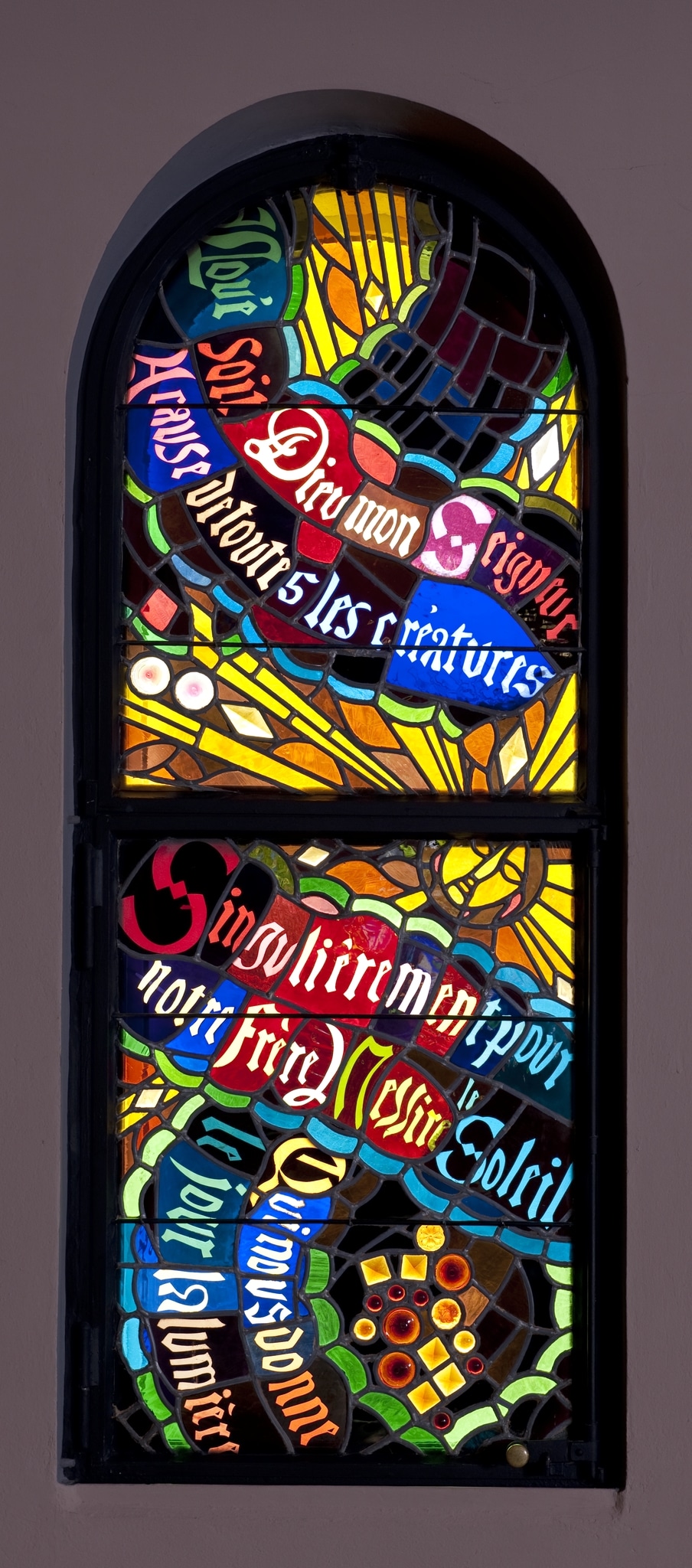 Ce vitrail est composé de deux panneaux sur chacun desquels se déploient des banderoles de différentes couleur, disposées en diagonale et sur lesquelles court l’extrait du Cantique de frère Soleil de François d’Assise, consacré au soleil. Les lettres sont aussi de teintes variées, selon une disposition identique au vitrail qui est à côté, consacré à la lune et aux étoiles.