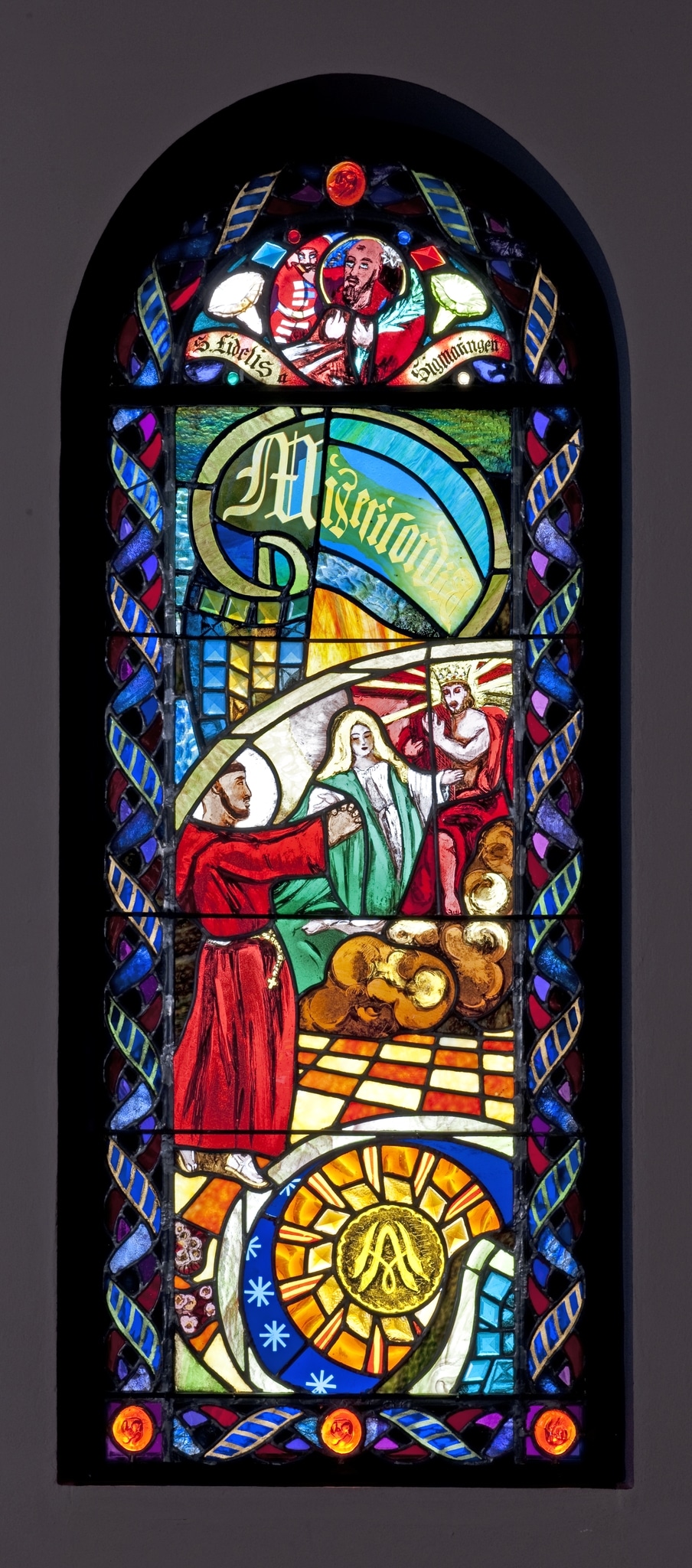 En haut, dans un médaillon, saint Fidèle de Sigmaringen se présente de trois quarts, portant la tonsure des capucins et la bure, et tenant dans sa main gauche la palme du martyre. A sa droite, un homme lève les mains pour l’assassiner. De chaque côté du médaillon apparaît une fleur en verre moulé-pressé (blanche à gauche, verte à droite), ainsi que des cabochons de différentes formes et couleurs. Un phylactère avec le nom du saint se déploie sous le médaillon.