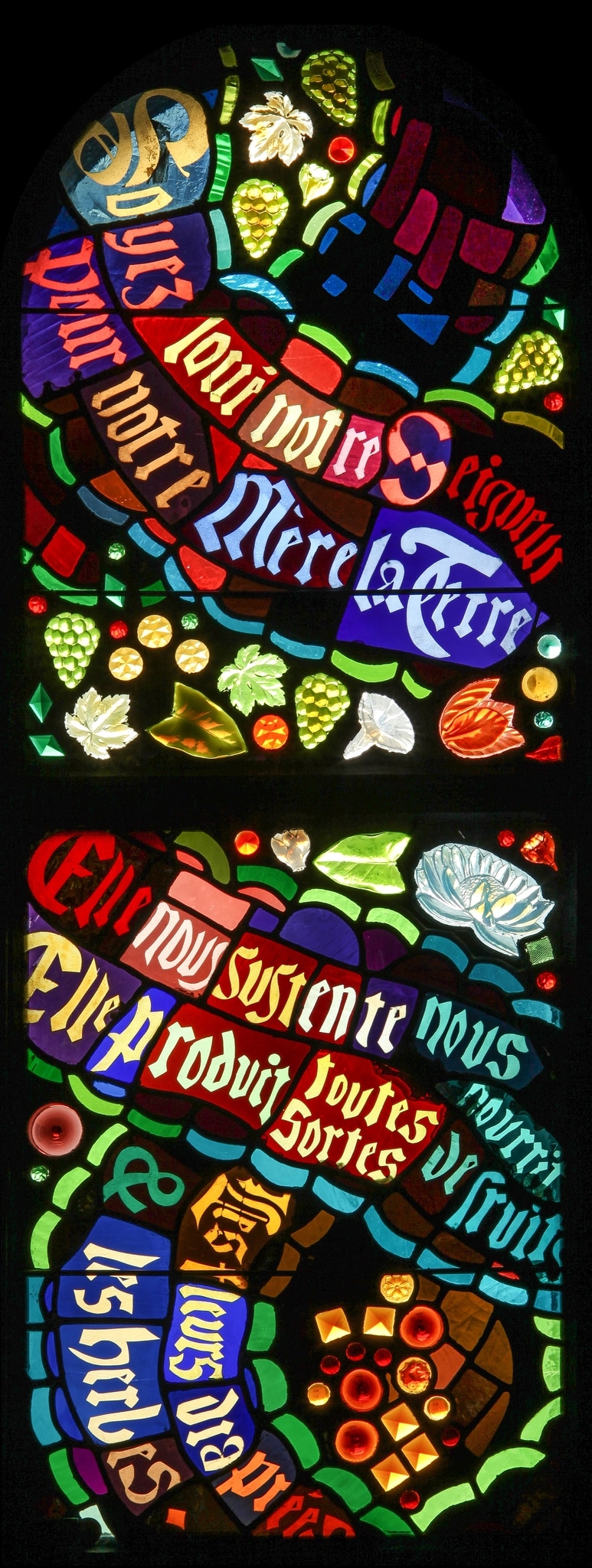 Ce vitrail est composé de deux panneaux sur chacun desquels se déploient des banderoles de différentes couleur, disposées en diagonale et sur lesquelles court l’extrait du Cantique de frère Soleil de François d’Assise, consacré à la terre. Les lettres sont aussi de teintes variées, selon une disposition identique au vitrail consacré au feu, qui se trouve sur la paroi d’en face, côté choeur.