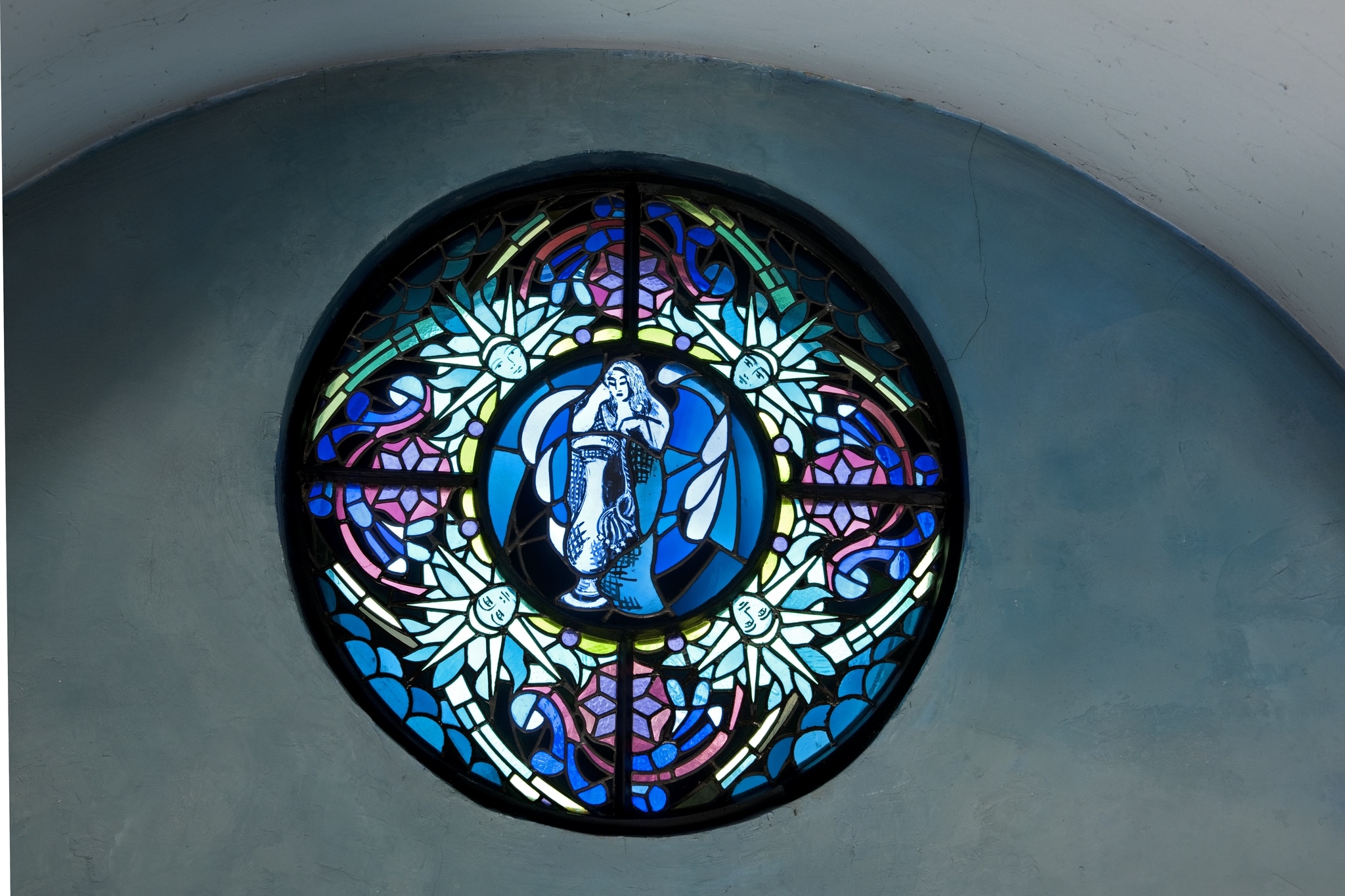 Ce vitrail a été réalisé par l’artiste genevois Alexandre Cingria et l’atelier Chiara de Lausanne pour l’une des sept ouvertures de la coupole surmontant le choeur hémisphérique de la nouvelle chapelle de l'Hôtellerie franciscaine à Saint-Maurice (ancien scolasticat puis Foyer franciscain), édifiée en 1940 par l’architecte romontois Fernand Dumas, également auteur de la restauration de l’ancienne chapelle entre 1929 et 1932.
