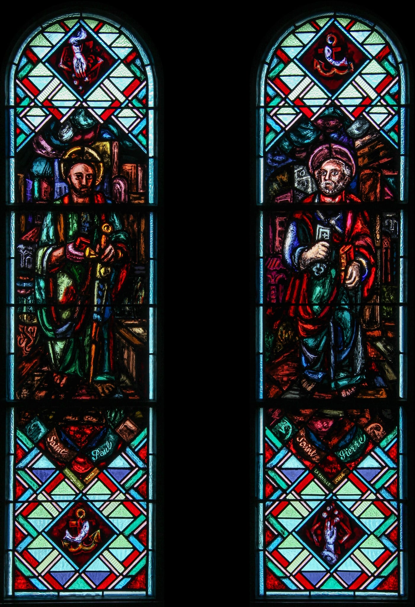 Les parties figurées des vitraux de la nef se caractérisent par un important travail à la grisaille que Landry applique avec une touche de peintre très vive, s’en servant pour créer des clairs-obscurs et des contrastes avec la luminosité des verres colorés. Les scènes sont rehaussées de touches de jaune d’argent, comme sur l’épée de saint Paul, apportant un effet précieux à l’ensemble. Les fonds géométriques présentent des jeux de textures par l’utilisation des verres cathédrale, cannelé et chenillés disposés selon un damier élaboré, d’une grande modernité. L’ensemble de ce travail confère une grande complexité aux verrières et permet à l’artiste de déployer l’ensemble de son savoir-faire à la fois de peintre de chevalet et d’artiste-décorateur.