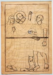 La guérison du boiteux : saint Pierre, debout au centre, auréolé et barbu, lève la main droite face au paralytique debout, s’appuyant sur une béquille. Un petit chien est assis entre les deux, et derrière Pierre, saint Jean nimbé les regarde.