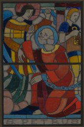 Ce vitrail se compose de quatre scènes relatant différents épisodes de la vie de saint Pierre avec, de haut en bas :