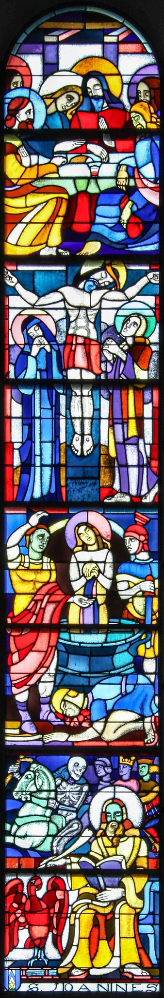 Ce vitrail se compose de quatre scènes relatant différents épisodes de la vie de saint Jean avec, de haut en bas :