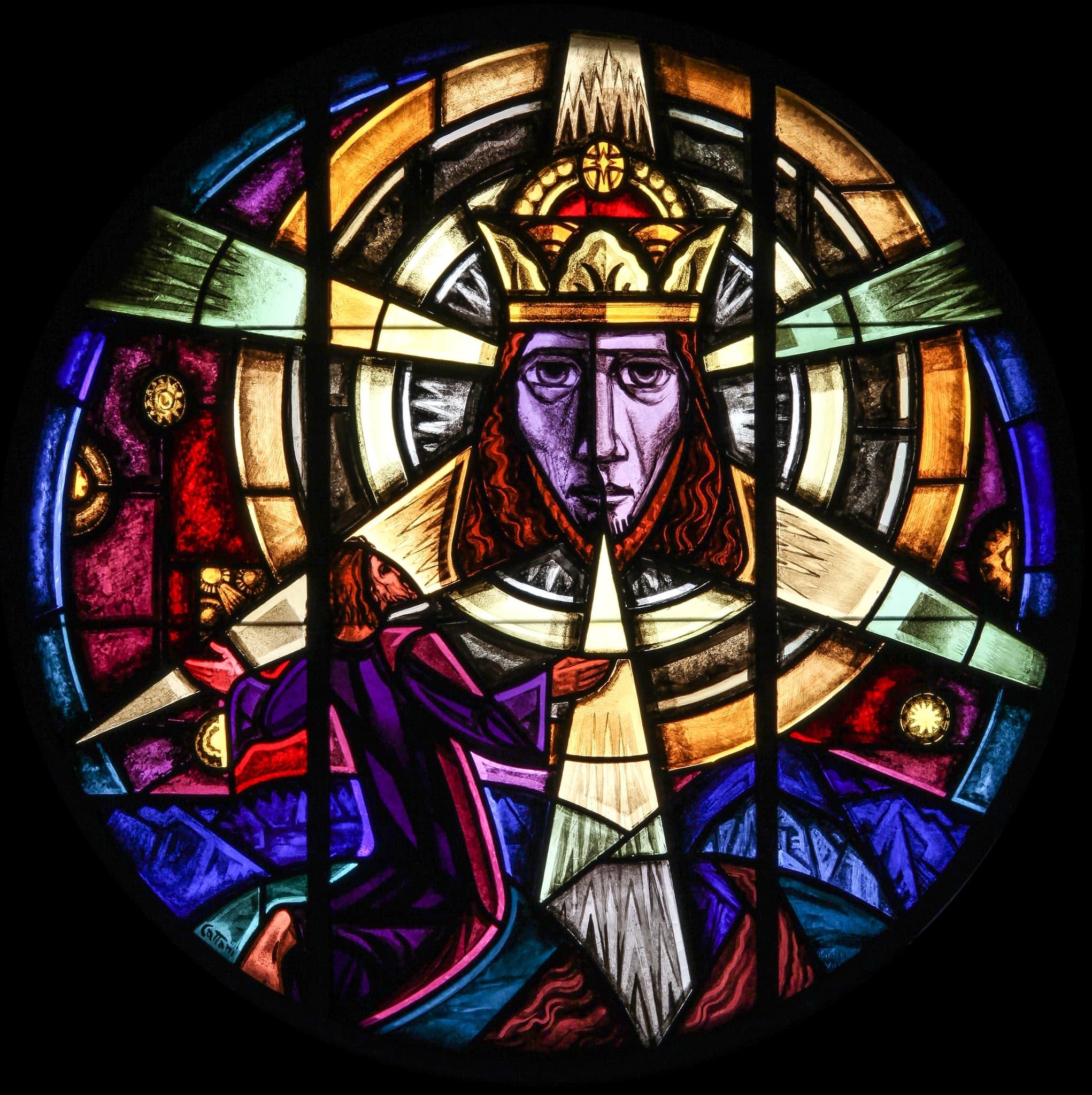 Alors que la peinture illustre au centre Nicolas de Füe accompagné du curé de Stans qui lui demande d’aller régler le conflit entre cantons-ville et cantons-campagne à la Diète de Stans, le vitrail montre la vision de Dieu expérimentée par Nicolas de Flüe. Elle se compose de coloris clairs et harmonieux se référant aux teintes de la polychromie générale choisie par Severini pour l’édifice, tandis que le vitrail présente des couleurs vives et fortement contrastées entre tons chauds et froids. En 1934, Cattani a traité du même sujet pour une des verrières de la chapelle du Salesianum à Fribourg. Bien que les bases de sa composition soient assez similaires, il choisit pour Saint-Pierre un parti beaucoup plus fort en donnant une présence imposante au visage de Dieu, devant lequel Nicolas de Flüe apparaît fluet et très humble. Le dessin a lui aussi évolué : lisse et doux au Salesianum, il devient puissant et vigoureux à Saint-Pierre.