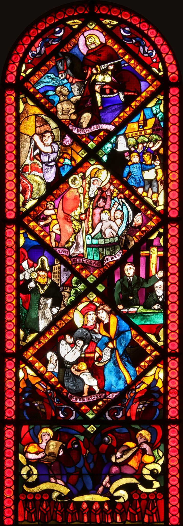 Cette verrière est composée de trois losanges superposés avec des scènes de la vie des saints Martin, Nicolas et Yves, désignés par des phylactères comportant également, pour le premier, des indications sur les dates de sa vie. En dessous de ces trois losanges, sont représentés deux anges musiciens, l’un chantant et l’autre jouant du luth, accompagnés de deux personnages à l’arrière-plan et au-dessus d’une procession de petits personnages stylisés dans les tons rouges.