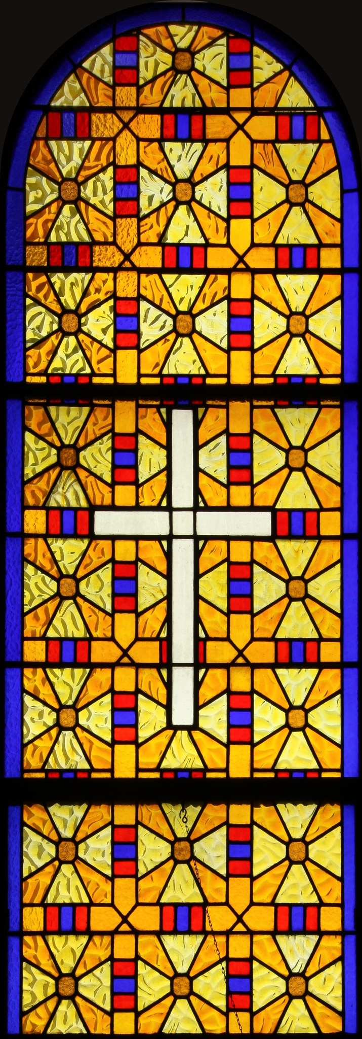 Faisant la part belle aux tons jaunes, ces vitraux présentent des motifs quasiment identiques, à la différence que les deux du choeur possèdent dans leur centre une croix en verre blanc, et que le panneau inférieur est rendu opaque par le mur de la sacristie se trouvant derrière chacun d’eux. N’étant pratiquement pas visibles depuis la nef, il était plus cohérent d’opter pour des vitraux ornementaux, ceux-ci étant bien moins onéreux que les vitraux figurés. Comme c’est souvent le cas à l’époque lors de la réalisation de verrières ornementales, l’atelier a opté pour des verres à reliefs, ici en particulier des verres dits “chenillés”, plus épais et retenant par conséquent plus la lumière que des verres simples. Ce choix permet ainsi d’éviter une arrivée lumineuse trop forte sur les côtés du choeur, ce qui aurait concurrencé le retable central et les deux vitraux latéraux qui l’accompagnent, eux-mêmes assombris par un dessin complexe et l’importante présence de la grisaille apposée par Cingria. Ils contribuent à créer une atmosphère chaude en harmonie avec les teintes imaginées par Dumas et Landry. Cette lumière dorée fait écho aux rameaux or qui parsèment la voûte du choeur, de même qu’à la richesse des panneaux du retable et de l’orfèvrerie de l’autel.
