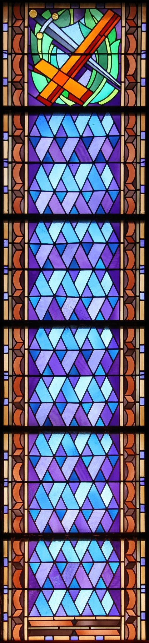 Il apparaît clairement que les vitraux n’ont pas été l’élément principal de la décoration de l’église, contrairement à la céramique, traitée à la manière de la mosaïque, que l’on retrouve partout dans l’édifice. Bien qu’il s’agisse d’un choix esthétique délibéré, nous pouvons tout de même nous demander si c’est aussi par manque de moyens financiers que des vitraux géométriques (bien moins chers que des vitraux narratifs), ont été choisis.