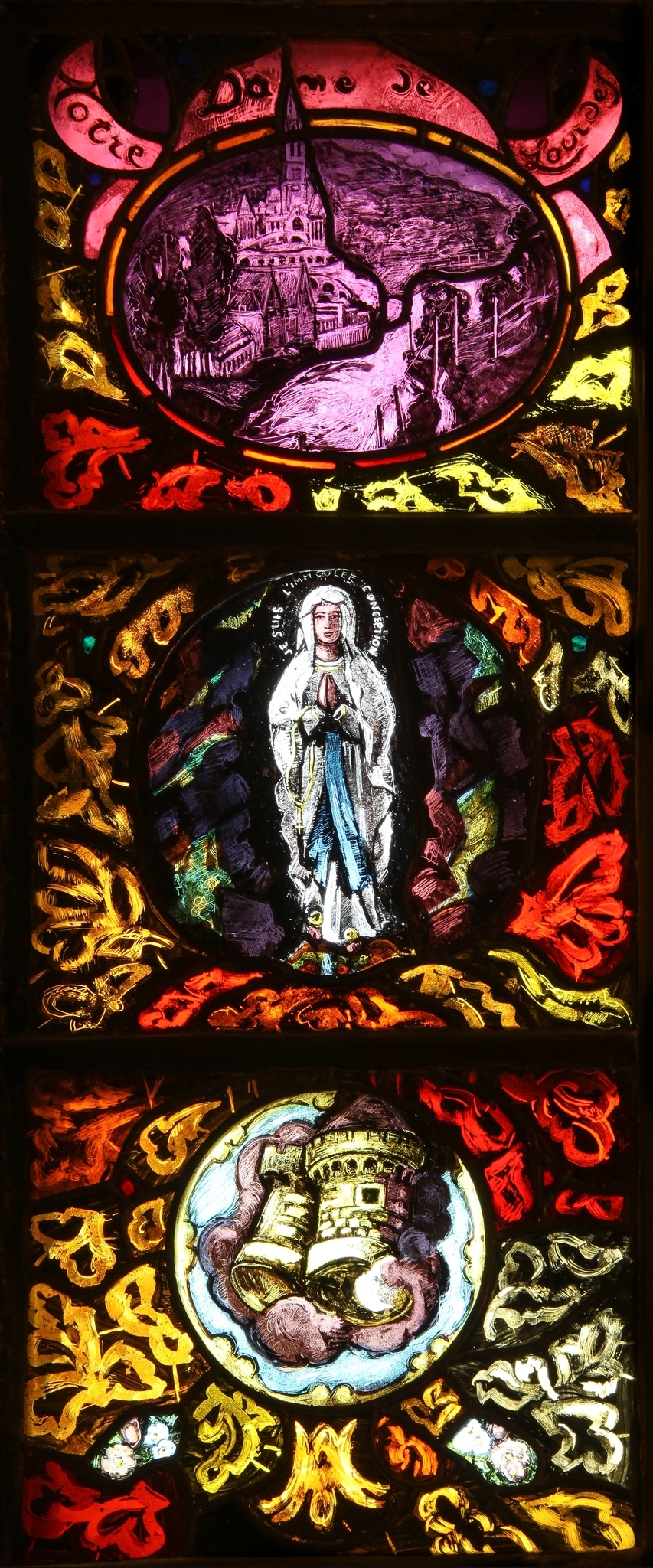 Les seuls vitraux à caractère narratif de l’église sont, avec la rose de la tribune, les cinq verrières ornant les fenêtres de la chapelle de la Vierge. Dans un texte autobiographique inédit, le curé Terrapon indique qu’ils sont un don de l’architecte Dumas (Terrapon, 1935, p. 223).
