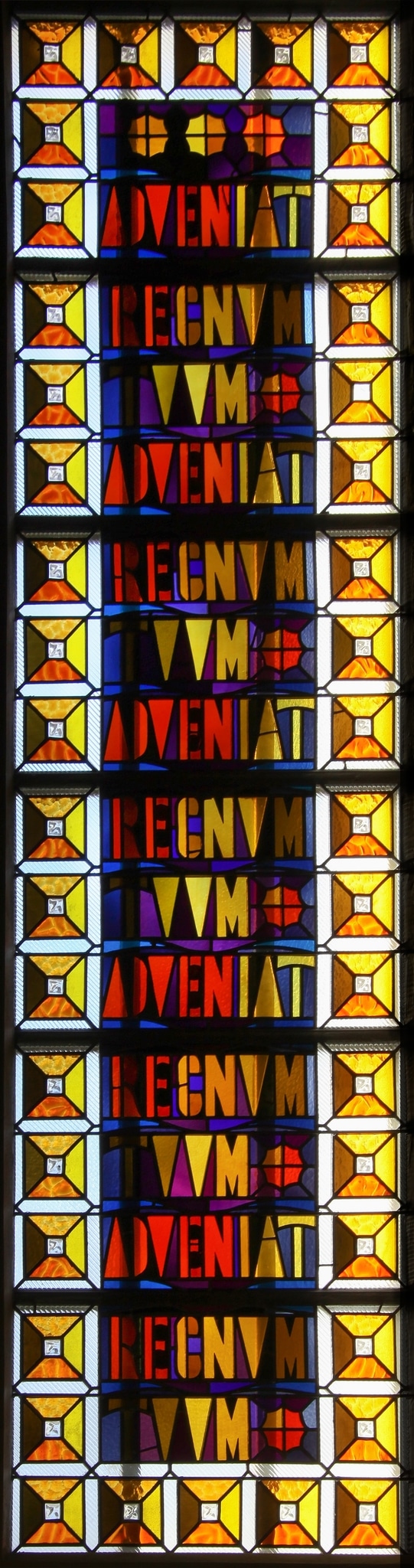 Un extrait du “Notre Père” en latin, “Adveniat regnum tuum” (que ton règne vienne) en lettres stylisées, traitées dans des couleurs allant de l’orange au jaune en passant par du beige, est répété cinq fois de haut en bas sur un fond de teintes froides composé de bleus et de violets. Une bordure constituée de carrés superposés (reprenant les coloris des lettres), encadrés de fines bordures en verre blanc cannelé entoure le tout.
