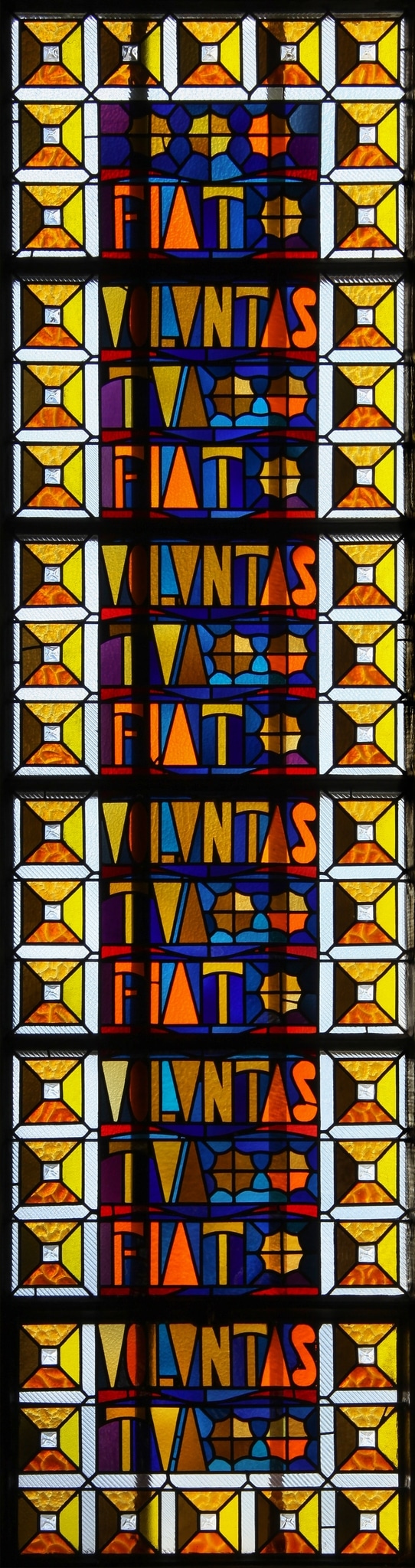 Un extrait du “Notre Père” en latin, “Fiat voluntas tuas” (que ta volonté soit faite) en lettres stylisées, traitées dans des couleurs allant de l’orange au jaune en passant par du beige, est répété cinq fois de haut en bas sur un fond de teintes froides composé de bleus et de violets. Une bordure constituée de carrés superposés (reprenant les coloris des lettres), encadrés de fines bordures en verre blanc cannelé entoure le tout.