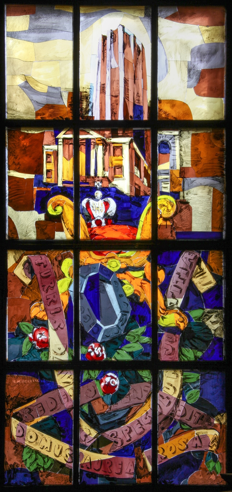 Fenêtre divisée en douze panneaux rectangulaires, avec une composition unique mettant en scène des représentations symboliques de la Vierge, tirées des litanies. Au premier plan, dans la partie inférieure, le “miroir de justice” est figuré par une gemme bleutée, entourée de phylactères déroulant des extraits des litanies dans différentes directions, entrecroisés de roses et de feuilles. Au-dessus du miroir, au centre, est posé le “trône de sagesse”, sur lequel est déposée une couronne. La partie supérieure est occupée par la représentation symbolique d’une ville avec, au premier plan, un bâtiment à fronton et colonnes évoquant un temple antique ou la “domus aurea” des litanies, surmonté d’une grande tour, la “tour de David”. L’arrière-plan est suggéré par des plages de verres brun, bleu et jaune pâle.