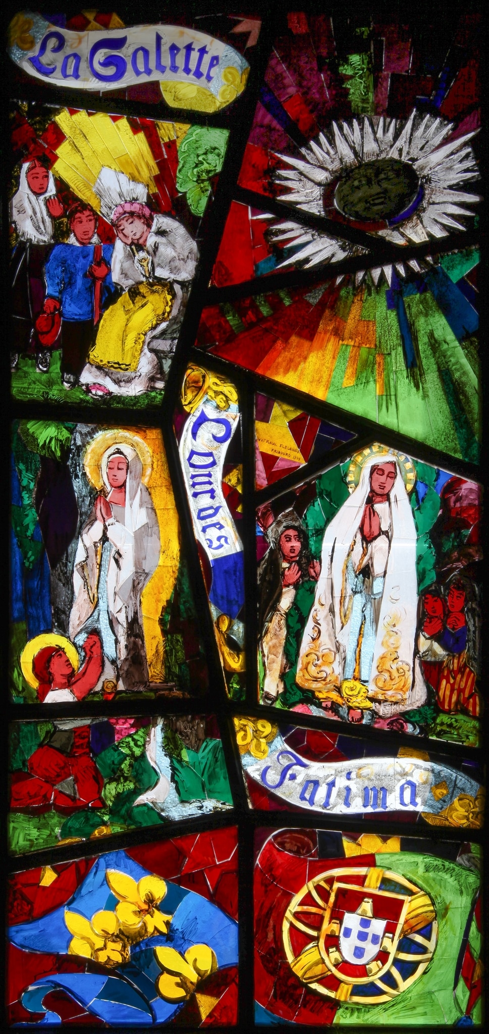 La fenêtre, rectangulaire, est divisée en différentes zones de formes irrégulières, comprenant des représentations symbolisant différents lieux de pèlerinage mariaux à l’étranger. Tout en haut à gauche est figurée la scène de l’apparition de la Vierge en pleurs à deux enfants au village de la Salette en Isère. Au centre à gauche, on reconnaît la scène de l’apparition de la Vierge à Bernadette Soubirous à Lourdes. La jeune Bernadette est agenouillée au premier plan, vêtue en paysanne, levant ses mains jointes vers la vierge vêtue de blanc qui se tient au-dessus d’elle, au sein d’un paysage suggérant une grotte envahie par la végétation. La vierge a une rose posée sur l’un de ses pieds et une source jaillit en dessous d’elle. Au centre du vitrail, une banderole blanche et bleue portant l’inscription “Lourdes” accompagne la scène.
