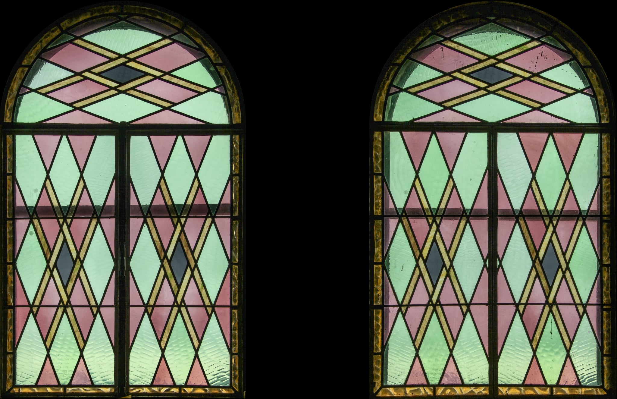 Deux vitraux ornementaux en plein-cintre identiques sont composés de verres très clairs (rose, bleu, jaune et gris), aux formes géométriques diverses (triangles, losanges, parallélogrammes). Une fine bordure les encadre.