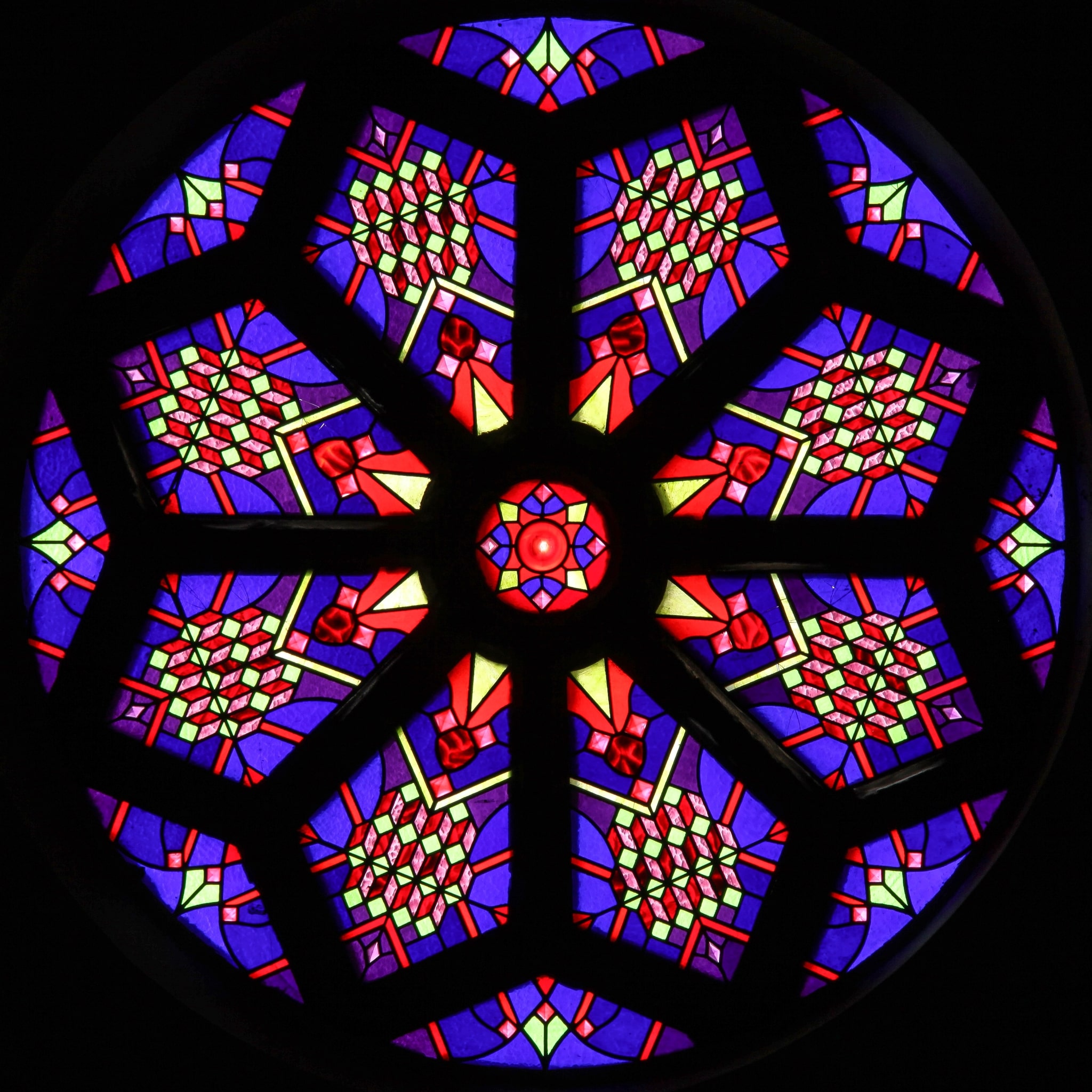 Une rose géométrique s’inscrit dans un meneau en étoile. Ce motif en étoile se répète à quatre reprises en s’élargissant depuis le centre vers l’extérieur. Différents motifs géométriques participent à cette composition et se détachent sur un fond bleu : triangles, losanges, carrés, rectangles et parallélogrammes. D’autres couleurs sont déclinées à travers ces différentes formes comme le rouge, le vert pomme et le rose.