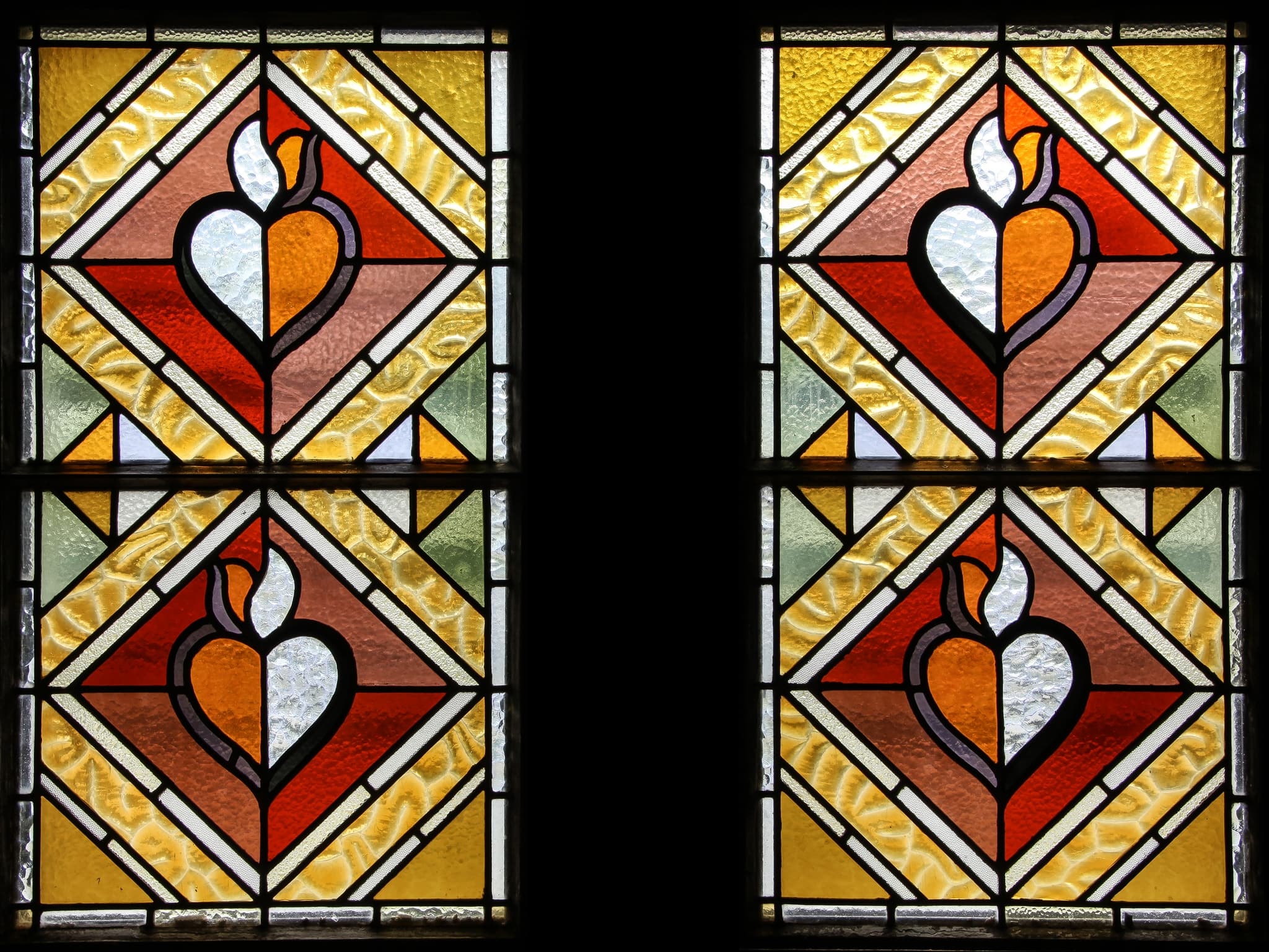 Deux fenêtres ornementales rectangulaires sont composées de deux losanges à larges bordures superposés, au centre desquels figure un Sacré-Coeur.