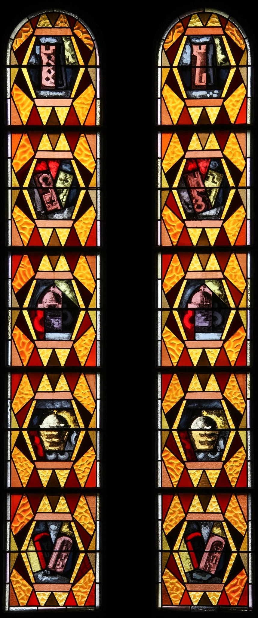 Fenêtre double en plein cintre composée de cinq panneaux comprenant chacun en leur centre un médaillon hexagonal sur un fond losangé. Chaque hexagone comporte un motif symbolique différent, peint à la grisaille. De bas en haut, on trouve les tables de la loi, la tiare pontificale, la représentation stylisée de la basilique Saint-Pierre de Rome, reconnaissable par son dôme et sa colonnade, les clés de saint Pierre, et une tour. Les symboles se répètent à l’identique sur la fenêtre de gauche et sur celle de droite, avec de légères variations.