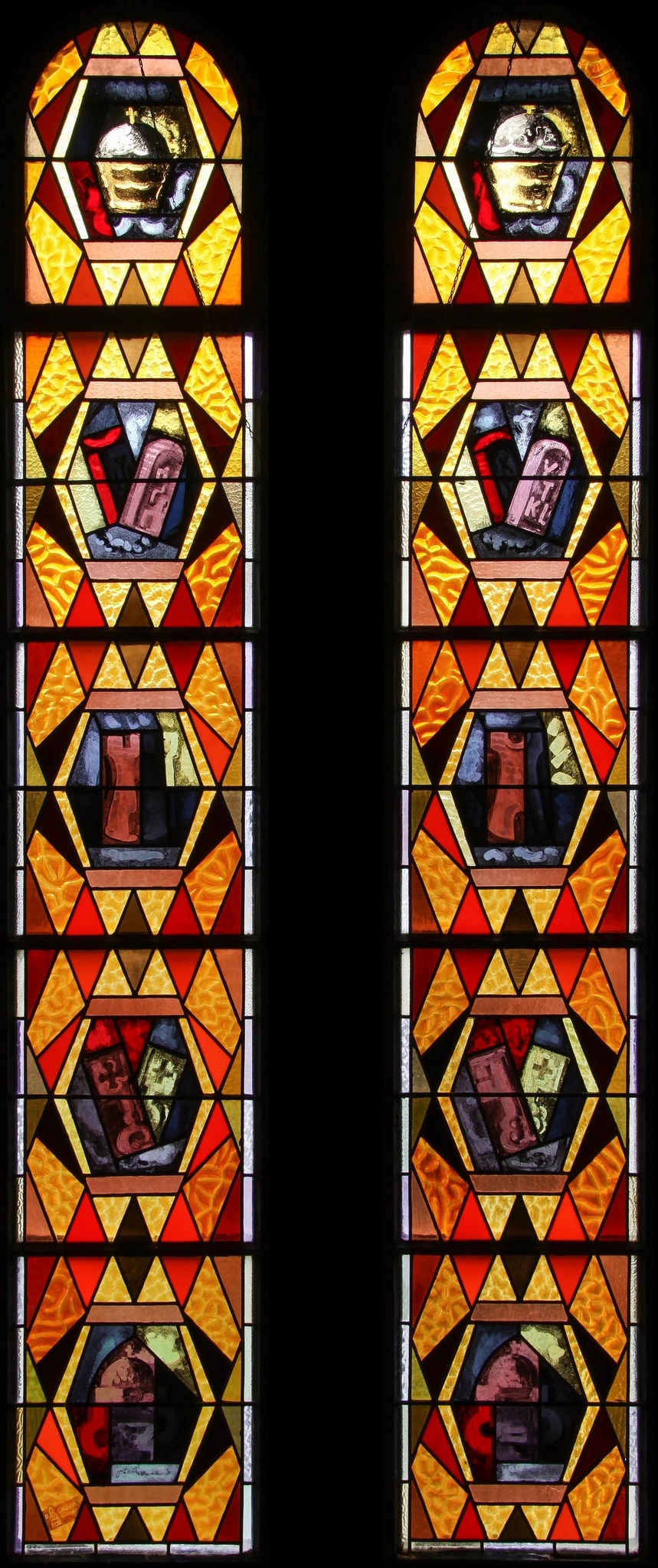 Les fenêtres de la nef représentent des symboles de l’Église liés au saint patron de l’édifice, l’apôtre Pierre, qui en tant que premier pape de Rome représente l’autorité de l’Église catholique sur terre. La tiare pontificale, la basilique Saint-Pierre de Rome et les clés renvoient directement à la papauté, tandis que les tables de la Loi et la tour symbolisent l’Église chrétienne au sens large. Malgré cette iconographie qui s’inscrit dans le programme iconographique dévolu à saint Pierre, culminant dans le choeur avec la monumentale peinture murale de Paul Monnier, le rôle de ces verrières est avant tout décoratif. Les médaillons figurés ne constituent qu’une petite partie de l’espace total occupé par un découpage géométrique de verres de différentes structures, verre chenillé et verre cathédrale, dont les teintes chaudes sont des rappels de la polychromie générale de la nef, déclinée autour de trois couleurs principales : le jaune, le rouge et le brun. On retrouve un parti similaire dans la nef de Sorens, une autre église de Fernand Dumas, où les vitraux de Cingria déploient une inscription dont la signification est évidemment très importante, mais dont l’artiste se sert dans une perspective en premier lieu décorative (par exemple, GSL_326). Ces vitraux, appelés “grisailles”, avaient l’avantage de coûter moins cher que des verrières figuratives lors de leur production par un atelier. A Murist, il apparaît clairement que les vitraux occupent une place secondaire par rapport à d’autres éléments de la décoration, comme les peintures murales ou le chemin de croix. Néanmoins, ces verrières expriment toute l’expérience de décorateur de Landry et son sens de l’ensemble.