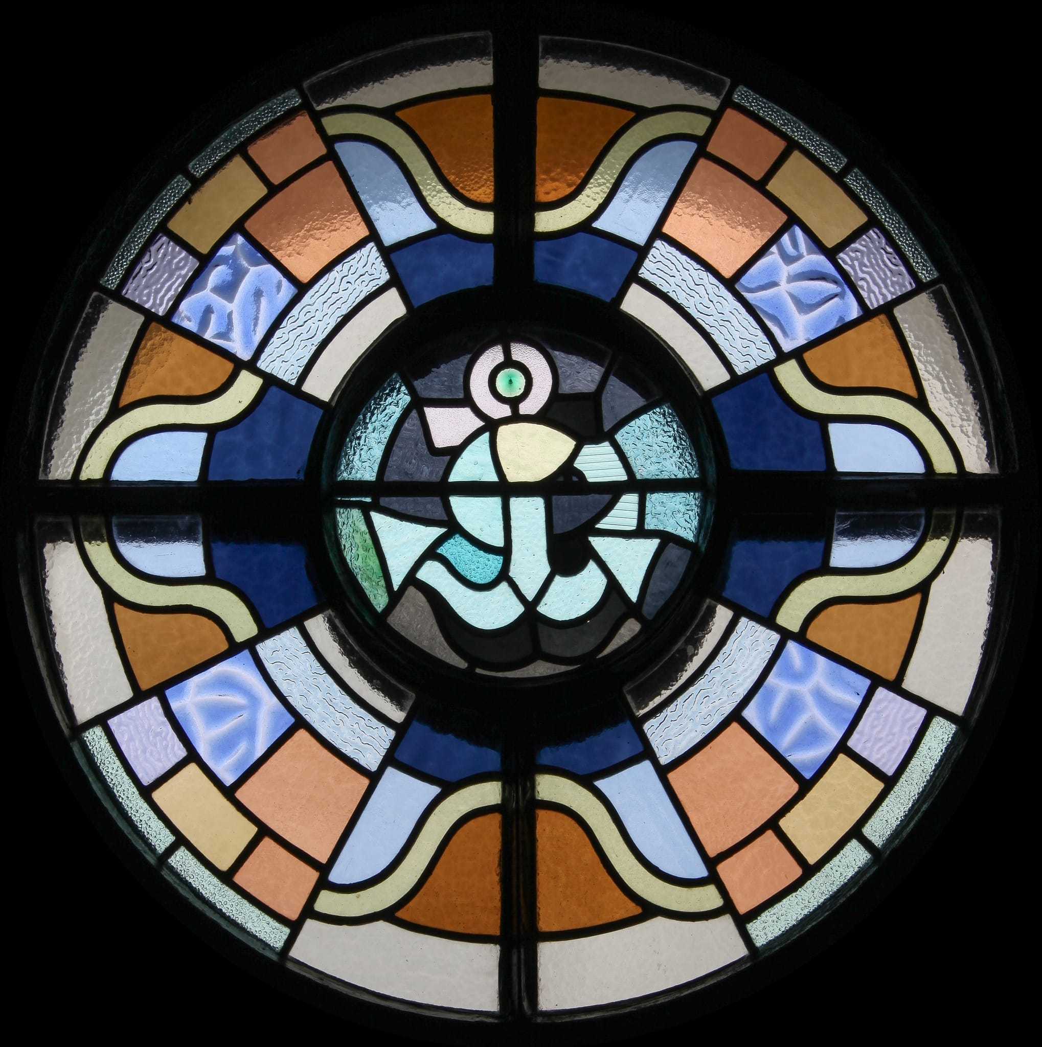Vitrail de forme circulaire avec un médaillon central représentant un poisson s’enroulant autour d’une ancre, dont le sommet est orné d’un cabochon. Une large bordure ornementale encadre ce médaillon, divisée en huit parties rayonnant autour du centre, agrémentées de pièces rectangulaires arrondies de différents formats et d’un filet formant des vagues.