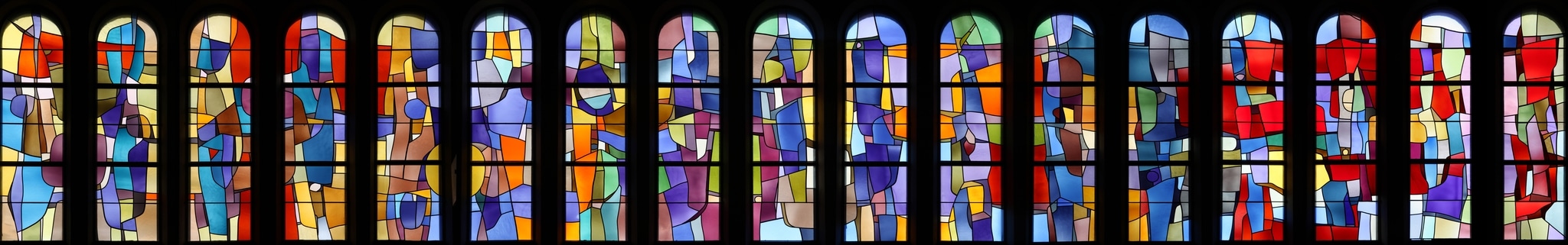 Les dix-sept verrières en plein cintre de la nef forment un ensemble continu homogène, constitué de motifs abstraits s’imbriquant les uns dans les autres et se prolongeant sur la fenêtre suivante.