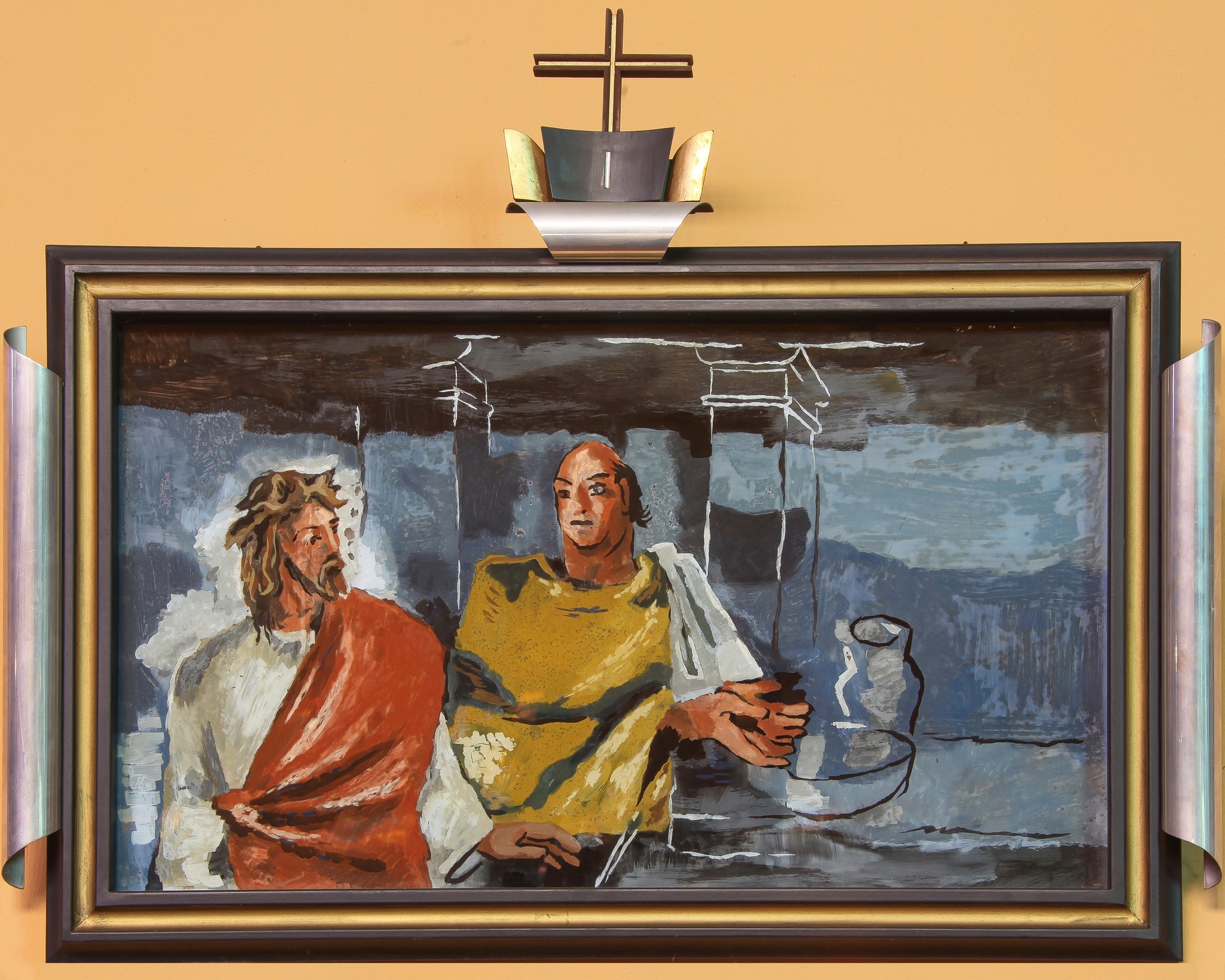 Au sein des églises du Groupe de Saint-Luc, la création de chemins de croix a permis aux artistes d’expérimenter diverses techniques artistiques et parfois d'introduire des innovations intéressantes, comme à Sorens, où Emilio Maria Beretta réalise en 1935-1936 douze stations en marqueterie avec des insertions d’aluminium. Sa démarche est différente à l’église catholique d’Aubonne, où il crée une frise continue en peinture murale en 1941. L’architecte Dumas lui confie également la réalisation du chemin de croix de l’église Saint-Pierre-aux-Liens de Mézières, une tâche qu'il avait initialement envisagée pour Théophile Robert (Lettre à l’abbé Théophile Perroud, AP Mézières, 27 février 1937), et que l’artiste tessinois exécute avec la technique de la peinture sous verre. Mobilisé en raison de la guerre qui ravage l’Europe, son travail est retardé, et il ne parvient à l'achever qu’en 1943 (Torche-Julmy 1997, p. 16). Ce n’est pas la première œuvre de Beretta en peinture sous verre, puisqu’il réalise quelques années plus tôt le grand retable représentant la Délivrance de Saint Pierre pour la même église, ainsi qu'un antependium pour la Triennale d’art sacré de Milan en 1933, deux œuvres monumentales témoignant de sa maîtrise de la technique (Noverraz/Sauterel 2024, p. 166).
