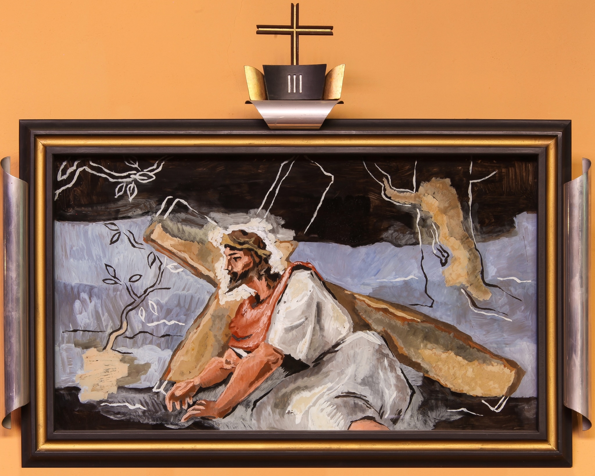 Cette peinture sous verre représente la troisième station du chemin de croix, où Jésus tombe pour la première fois sous le poids de la croix. Beretta capture le moment de sa chute lorsque le Christ s'est affaissé par terre, écrasé sous le poids de la croix, une main tendue vers l'avant, l'autre posée au sol. Il porte la couronne d'épines, une tunique blanche et un manteau rouge. L'arrière-plan, composé de formes abstraites, évoque un paysage austère.