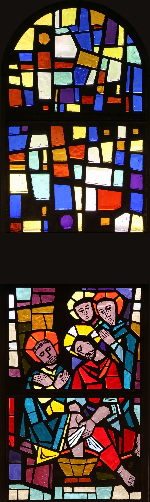 Le dessin de la partie abstraite de ce vitrail est repris dans la baie attenante, mais Yoki l’inverse selon une symétrie axiale verticale pour apporter une impression de diversité.