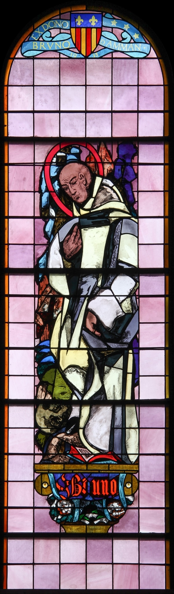 Au centre d’une fenêtre en plein cintre, Bruno nimbé debout en pied repose sur un socle comprenant une inscription avec son nom, décoré d’une corbeille de fleurs rouges et blanches et de feuilles, entourée de ruban bleu. Le saint au crâne rasé est vêtu de la longue robe blanche des Chartreux. Il lève la main droite vers son coeur, baissant son regard vers un crâne posé à ses pieds, devant lesquels se trouve aussi un livre ouvert. A l’arrière-plan se détache un paysage montagneux caractérisé par des rochers escarpés. Le fond de la verrière est traité en carreaux de verre simple dans des tons roses pastel, tandis qu’une fine bordure jaune-orangée à gauche et brune à droite délimite le pourtour de la fenêtre. Au sommet du vitrail, une banderole bleu clair comportant le nom du donateur se déroule autour de ses armoiries.