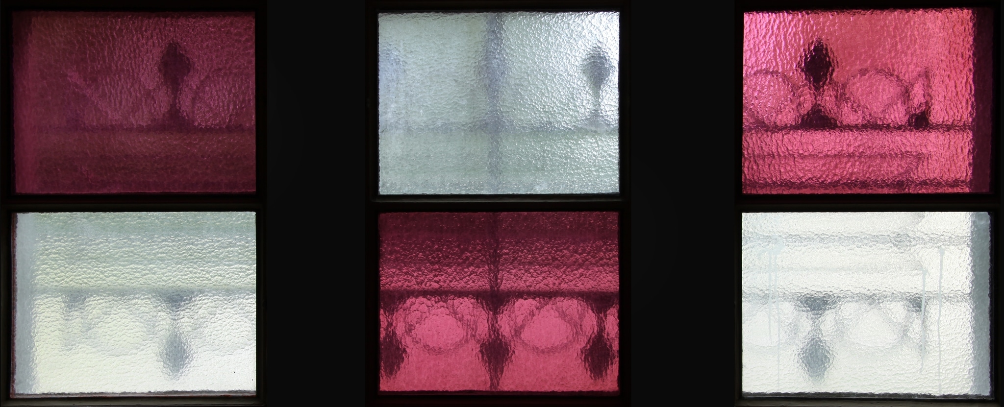 Ces trois fenêtres du baptistère sont composées chacune de deux panneaux de verre cathédrale de couleur rose et blanche. Alors que le blanc dans l’ouverture centrale est en haut, il est situé en bas sur les deux fenêtres extérieures.