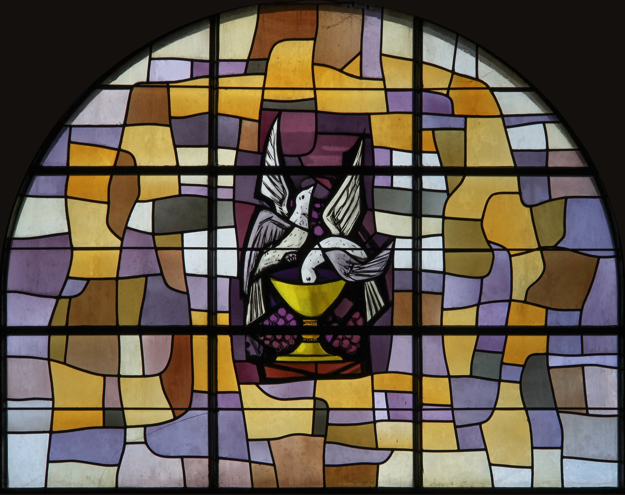 Au centre du vitrail abstrait, sur un fond mauve violet, deux colombes sont posées sur le bord d’un calice, l’une y buvant alors que l’autre s’y dresse, les ailes ouvertes. Des grappes de raisin sont disposées à l’arrière-plan.